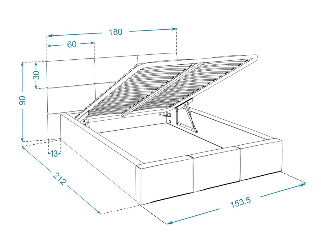 - Anyaga: Trinity szövet (100 % poliészter), DTD bútorlap szerkezet, gázrugók az ágyrács megemelésére