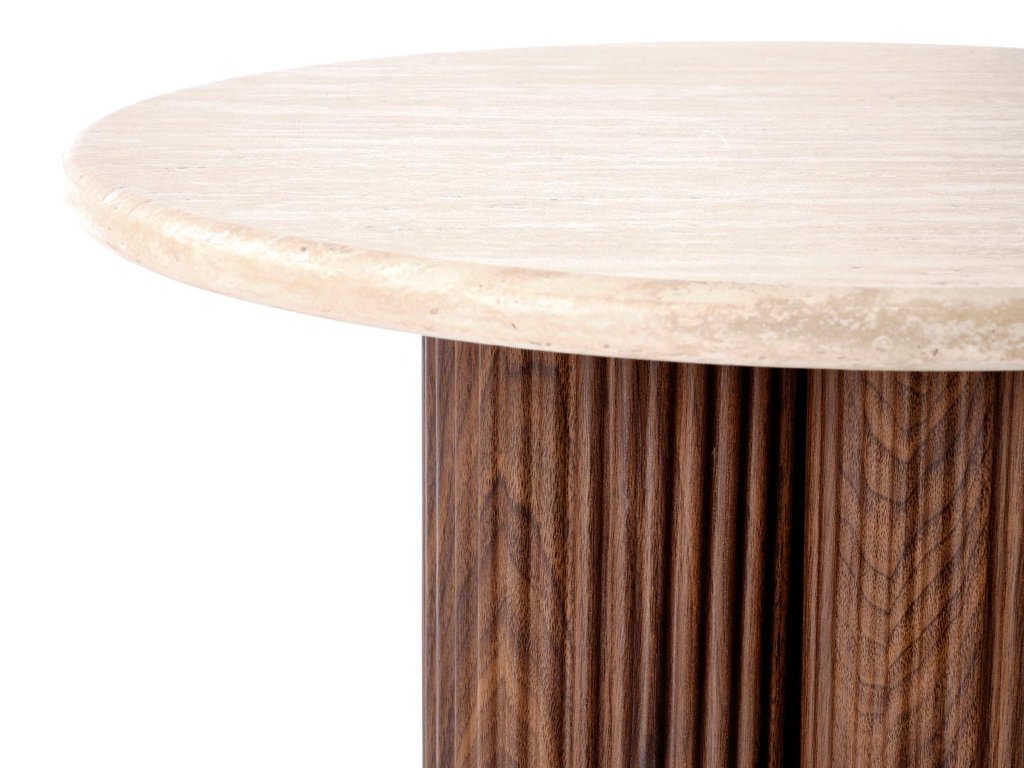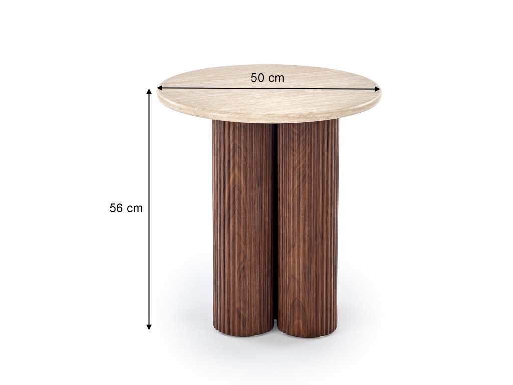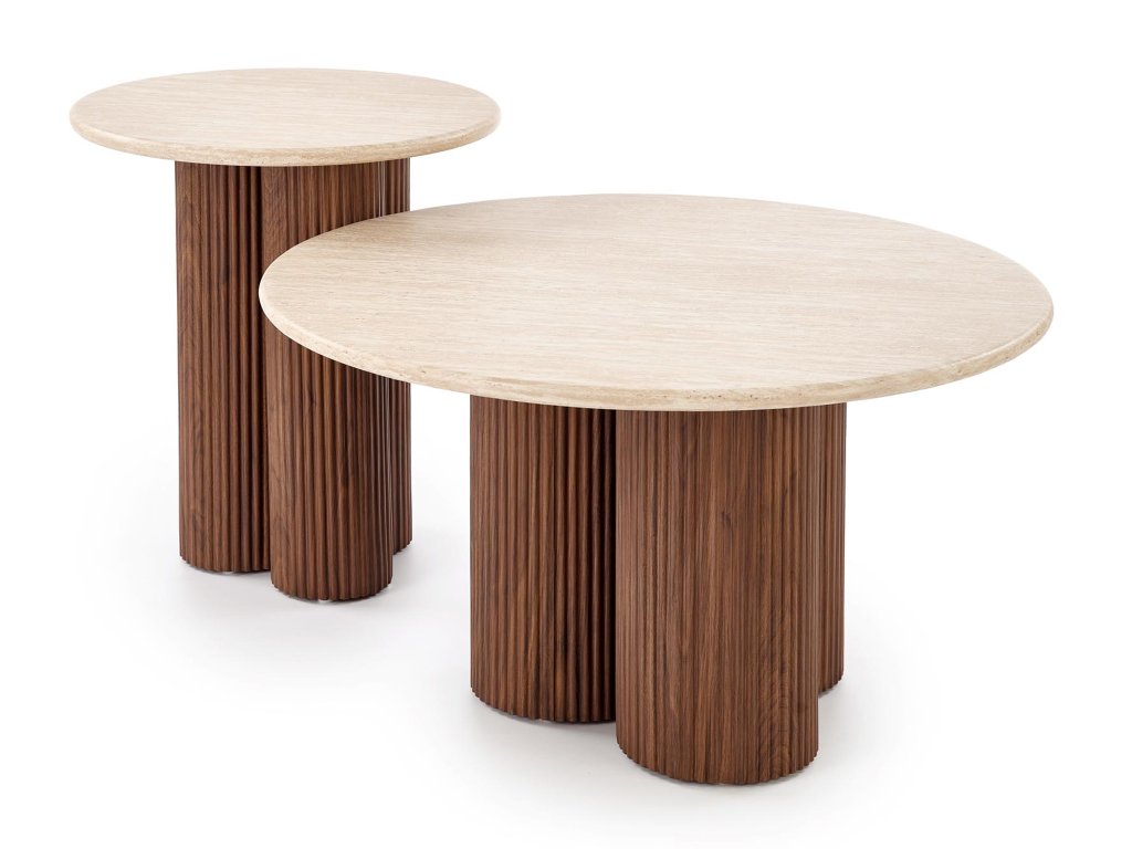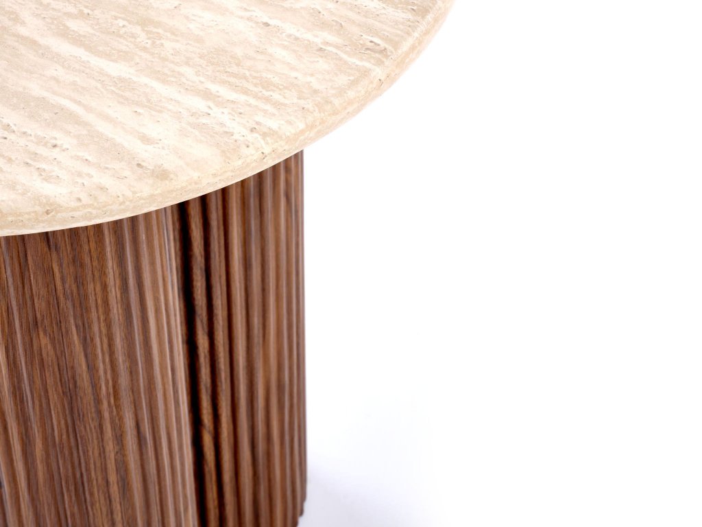 A DOROTEA S dohányzóasztal a travertin eleganciáját ötvözi a meleg dió színnel. Finom, luxusos kinézetével bármely nappali középpontja lesz. Kompakt méreteinek és stabil, oszlopos kialakításának köszönhetően kisebb és tágasabb szobákban is remekül mutat. Kerek formája és modern kinézete miatt jól illik a modern, a minimalista vagy akár a klasszikus enteriőrökbe is.
