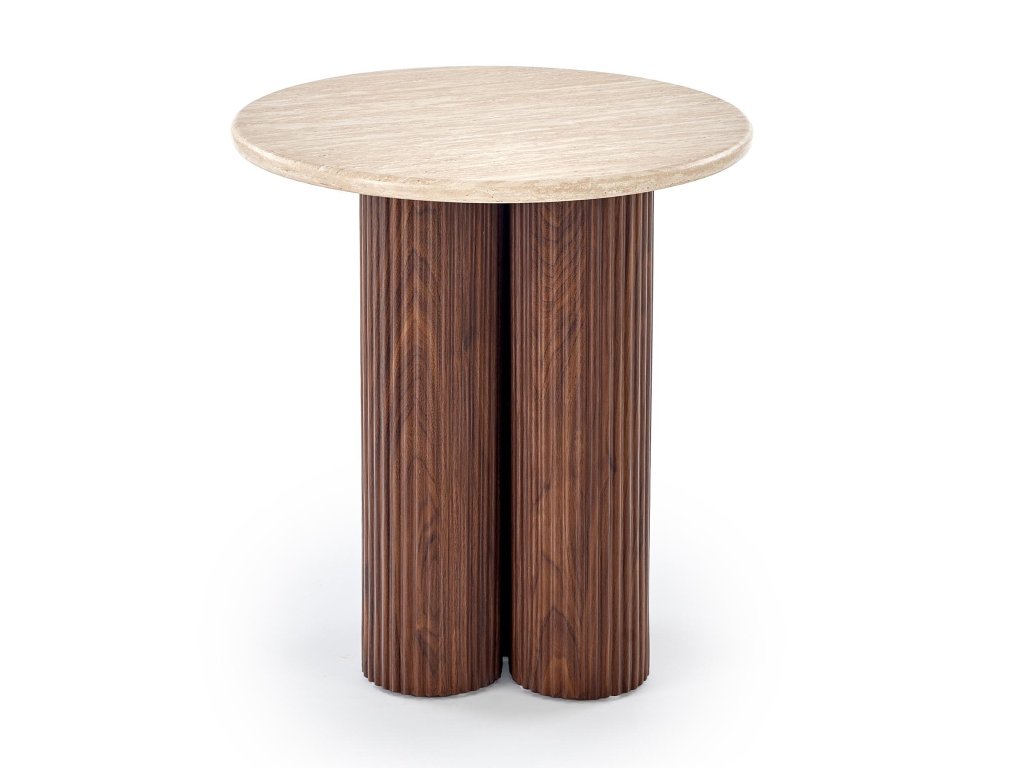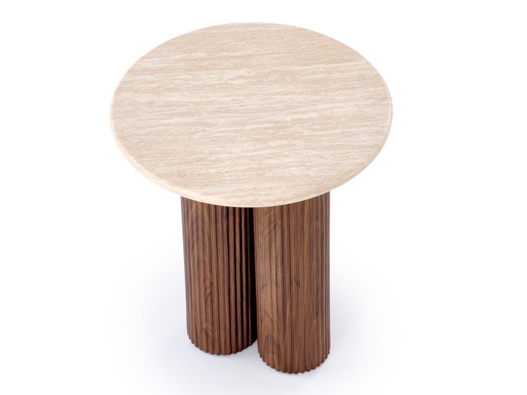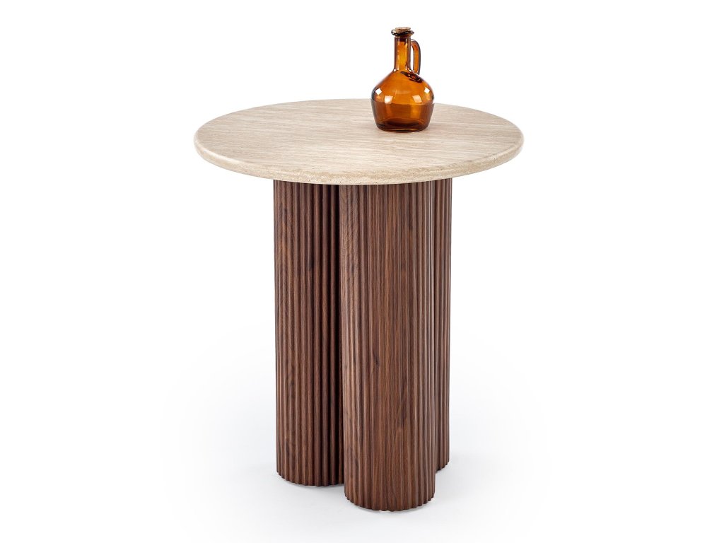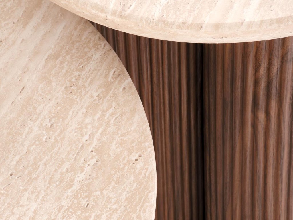 A DOROTEA S dohányzóasztal a travertin eleganciáját ötvözi a meleg dió színnel. Finom, luxusos kinézetével bármely nappali középpontja lesz. Kompakt méreteinek és stabil, oszlopos kialakításának köszönhetően kisebb és tágasabb szobákban is remekül mutat. Kerek formája és modern kinézete miatt jól illik a modern, a minimalista vagy akár a klasszikus enteriőrökbe is.