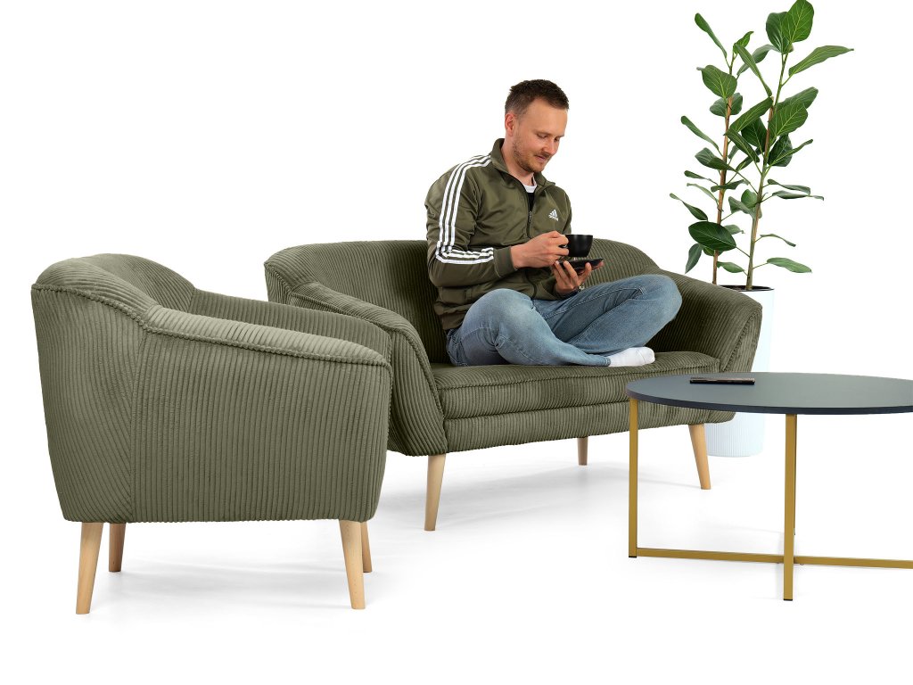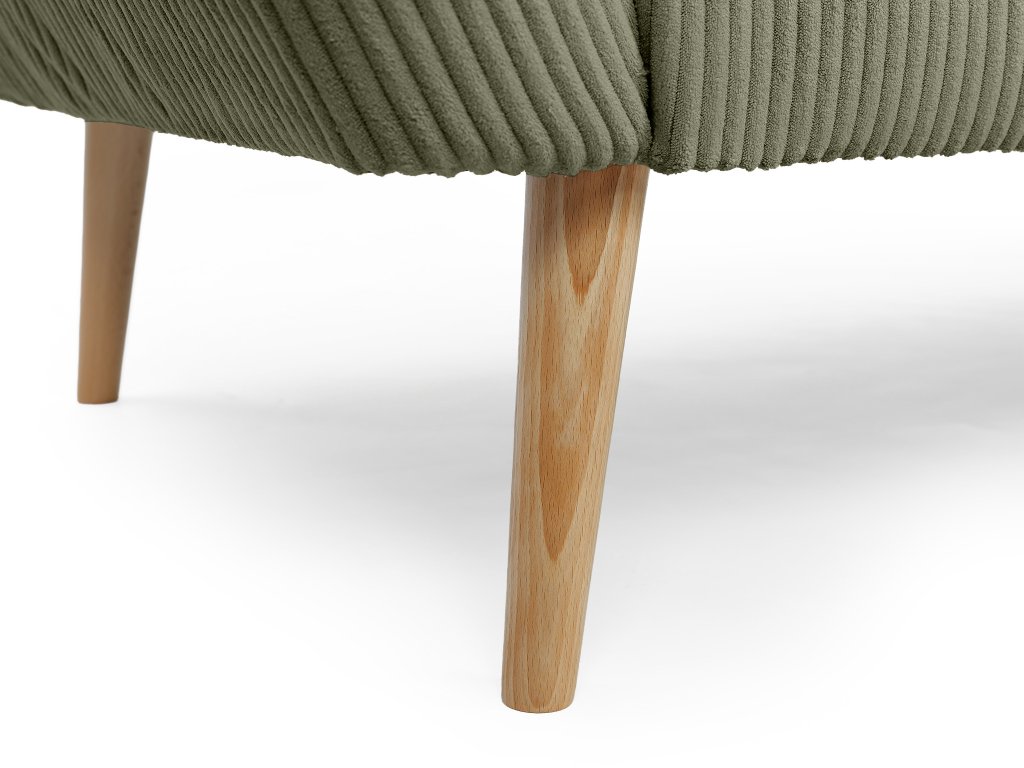 Az olívazöld szín időtálló karaktert ad a fotelnek, amely azonnal magára vonja a figyelmet, és otthonosabbá teszi a helyiséget. A tömör fa lábak biztosítják a bútor stabilitását. A lekerekített formák tovább növelik a biztonság és a kényelem érzetét.