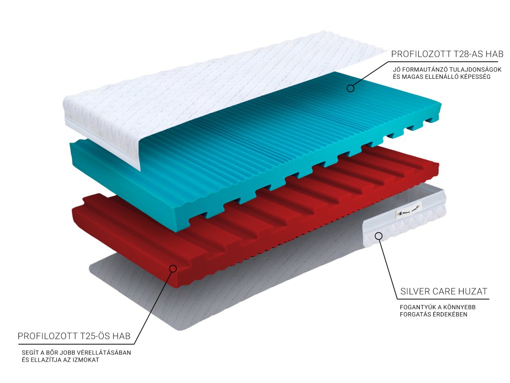 A magas minőségű 7 zónás profilozott hab biztosítja a megfelelő vérkeringést a bőr alatt és az izmok ellazulását alvás során. Hő hatására hozzáidomul a test formájához, így biztosítja a kellemes pihenést. A 7 keménységi zónának köszönhetően megfelelő alátámasztást nyújt a hátgerincnek és az egész testnek. Ez a hab allergiások számára is megfelelő.