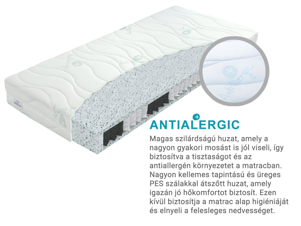 A kétoldalas matrac antiallergén cipzáras huzattal rendelkezik. Ez a huzat tartós, és kitűnően ellenáll a gyakori gépi mosásnak is. Antiallergén és antibakteriális tulajdonságokkal rendelkezik, így allergiások számára is alkalmas. Nagyon kellemes tapintású, és az üreges PES szállal való steppelés jó hőkomfortot biztosít. Emellett biztosítja a matrac alapvető higiéniáját és elnyeli a felesleges nedvességet.