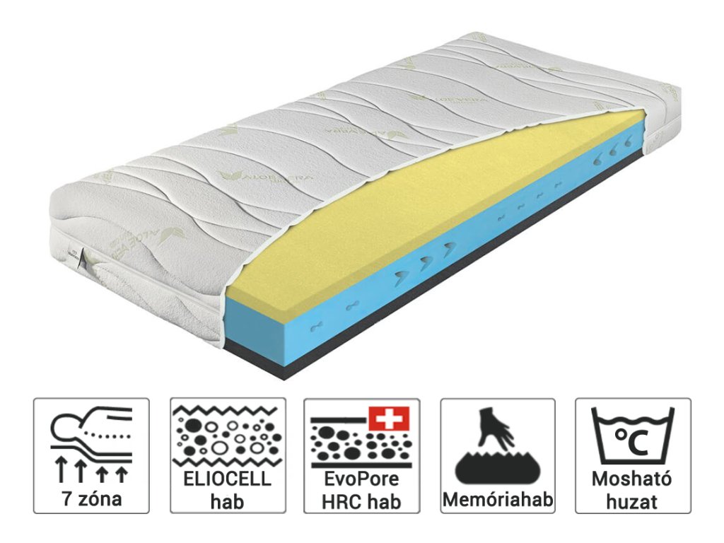 Anyagösszetétel: Elasztikus VISCO hab, ELIOCELL HAB, EvoPore HRC hab, Huzat