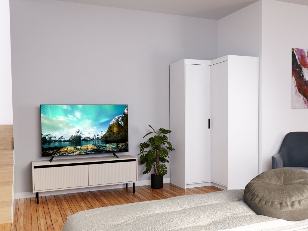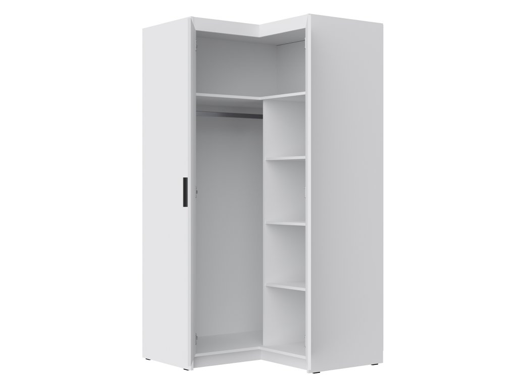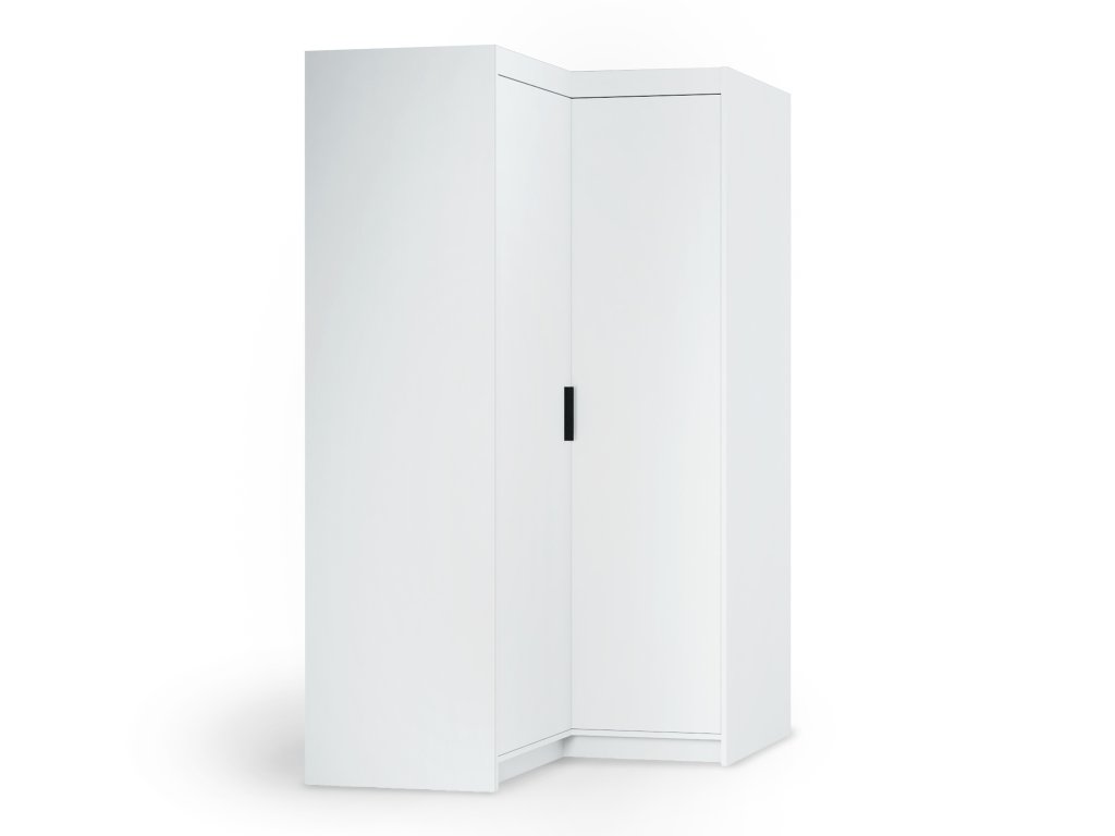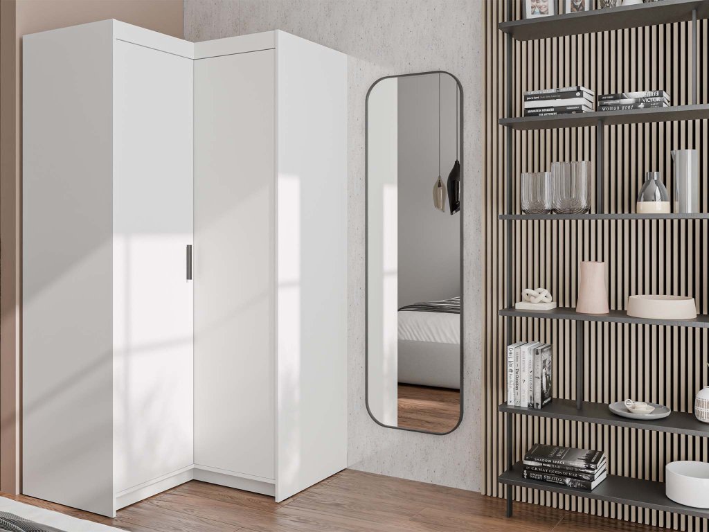 A fehér Elenas 2D sarokgardróbszekrény kiváló megoldás a hely hatékony kihasználására. Praktikus sarokkialakításának köszönhetően elegendő tárolóhelyet biztosít anélkül, hogy túl sok helyet foglalna el a szobában.