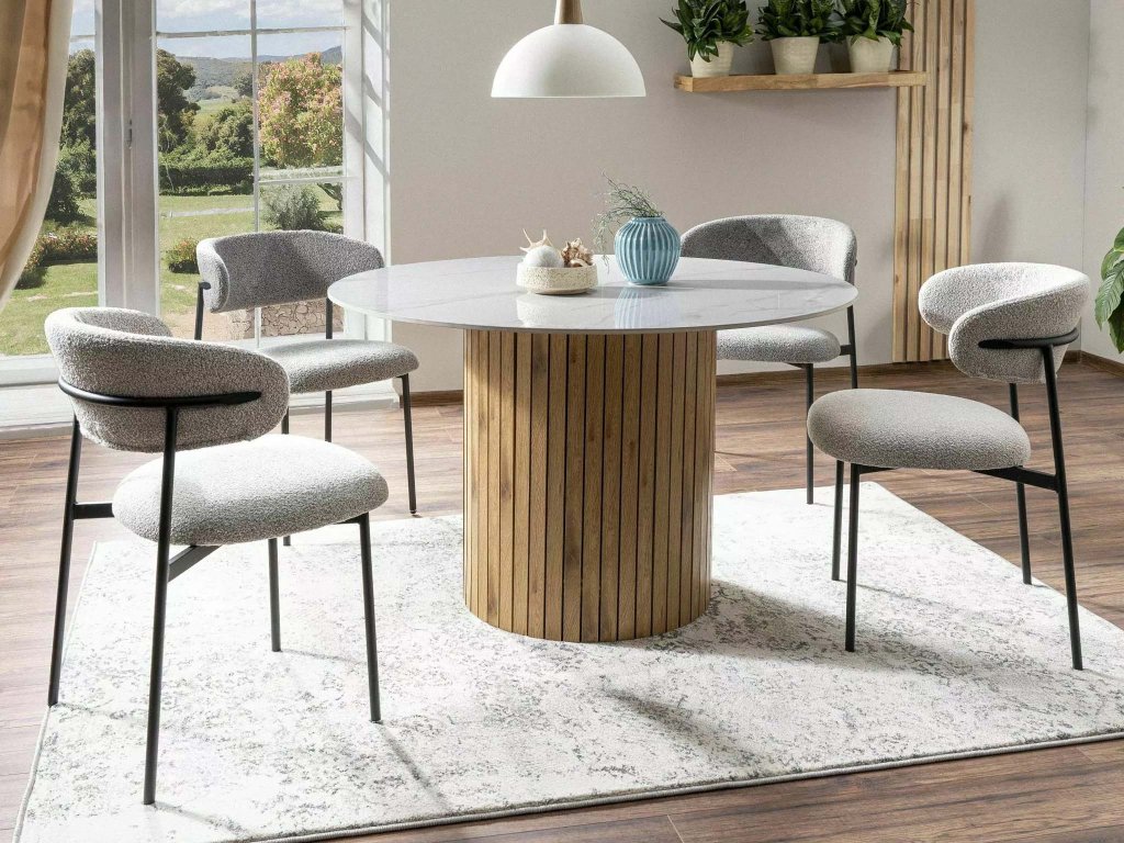 Az Elton étkezőszék kellemes tapintású szövettel van kárpitozva elegáns szürke színárnyalatban, amely könnyen összeillik a szobában lévő többi bútor színével. Finoman texturált felülete időtálló hatást kelt. Az étkezőszék masszív, fekete színű fém vázzal rendelkezik, amely stabilitást és hosszú élettartamot biztosít. Az étkezőszék azonban nemcsak az étkezőbe, de a konyhába vagy a nappaliba is ideális választást jelent. Az Elton szék letisztult formájának köszönhetően jól illik a modern és a klasszikus belső terekbe egyaránt. Magas üléskomfortja miatt kiválóan alkalmas mindennapos használatra és hosszabb étkezésekhez, beszélgetésekhez is az étkezőasztal mellett.
