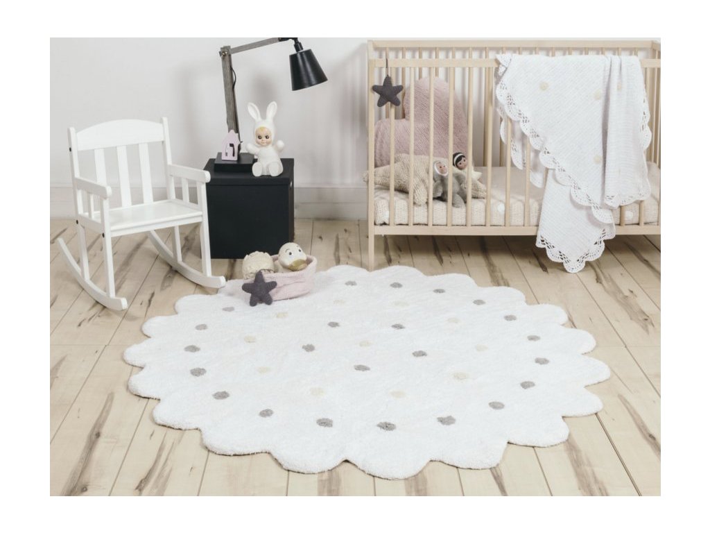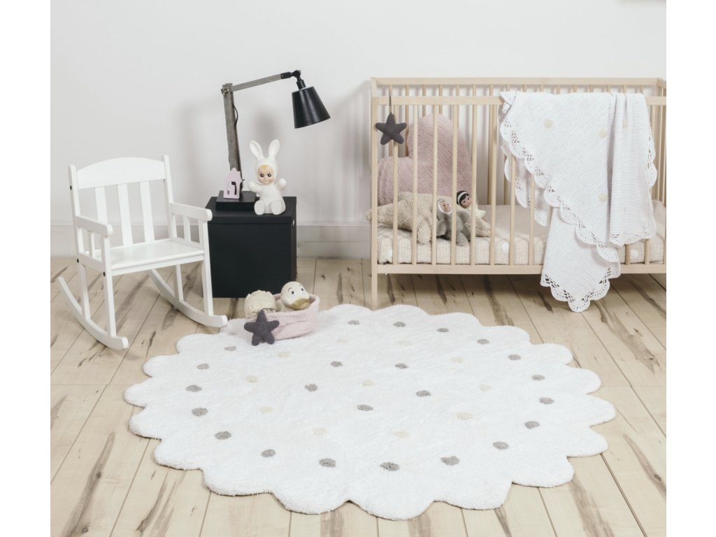A spanyol Lorena Canals márka kézzel szőtt nagy kerek szőnyege lágy fehér színű és magas minőségű pamutfonálból készült. A kör alakja, a hullámos széle és a rajta található pöttyök sajátos külsőt kölcsönöznek neki. Tökéletes dísze lehet úgy a gyerekszobának, mint az ifjúsági szobának is, valamint nagyon jó hőszigetelő tulajdonsággal is bír. A szőnyeg 140 cm méretben kapható.