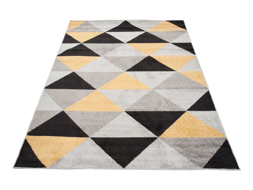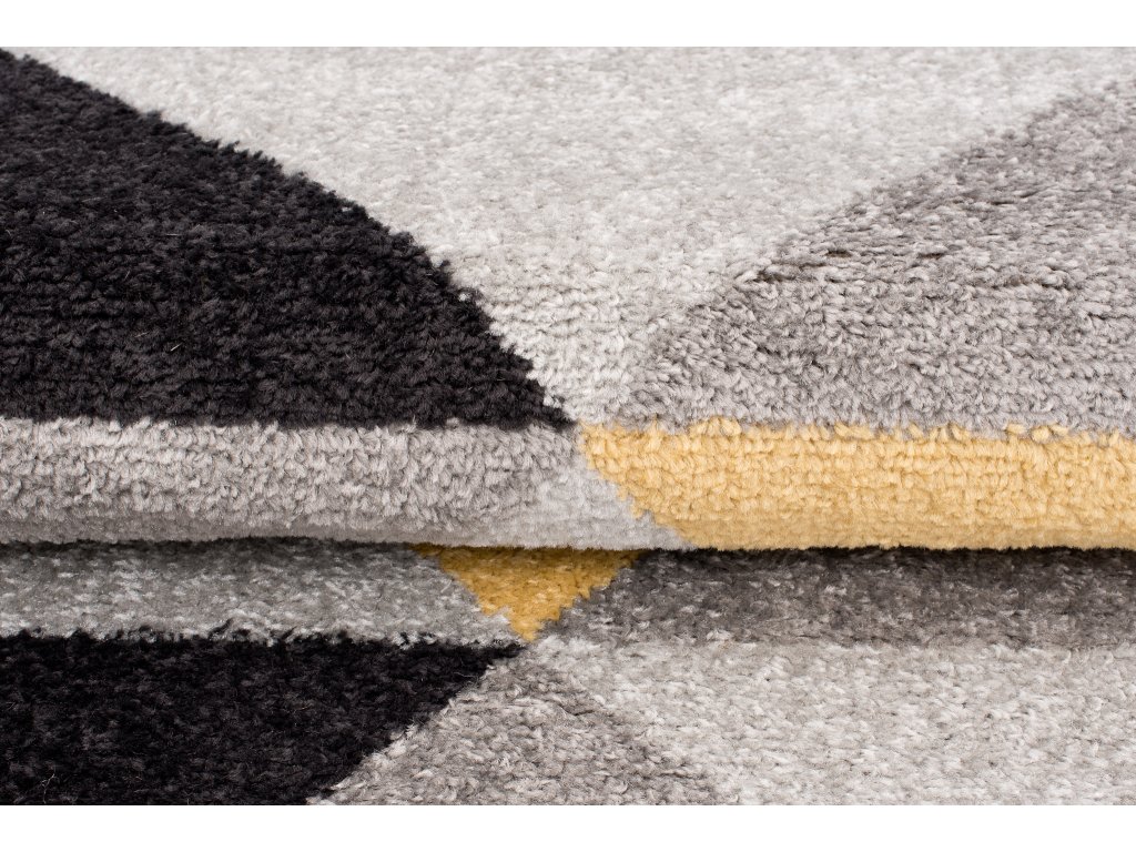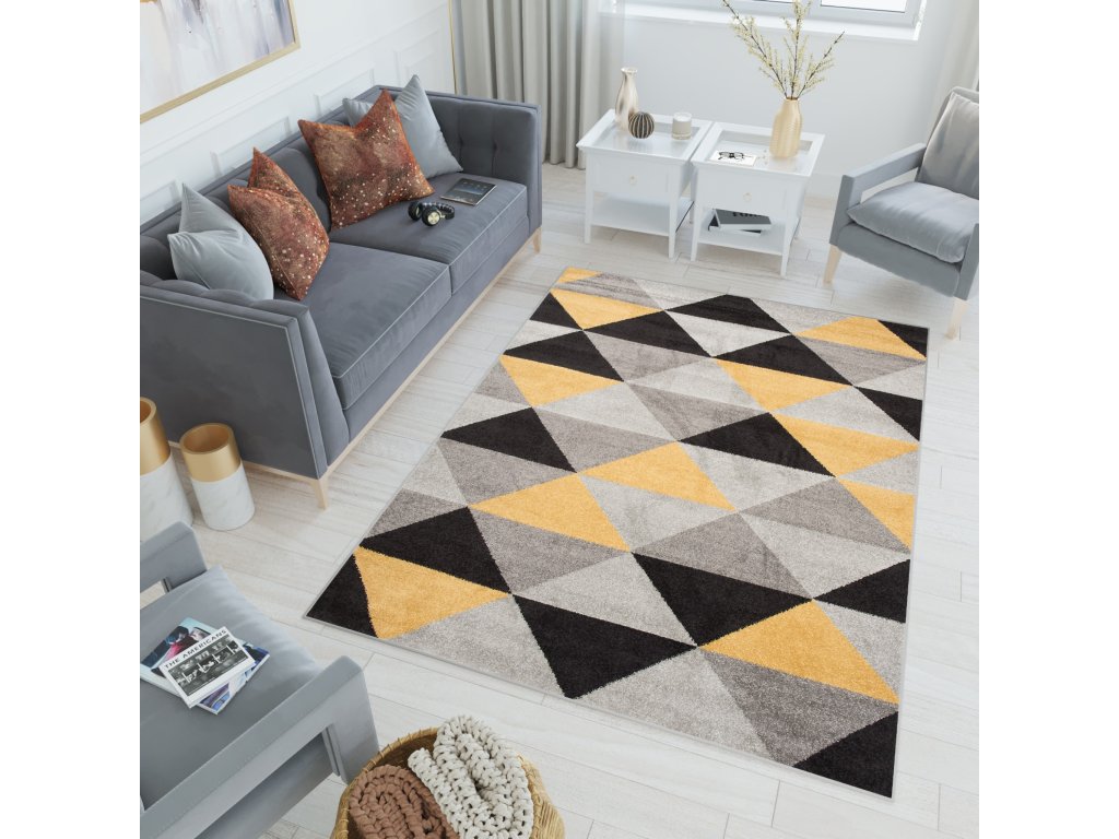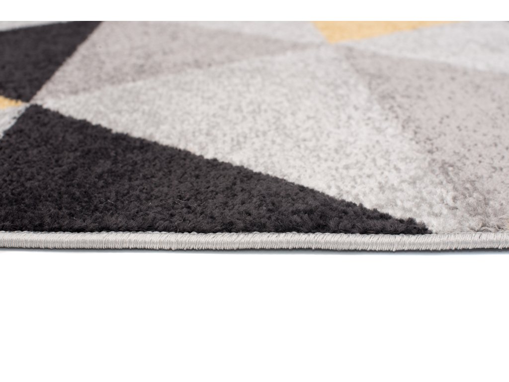 Fekete, szürke és sárga geometrikus mintával díszített modern szőnyeg a klasszikus és a modern otthonokba egyaránt. A designjának köszönhetően tökéletes nappali, hálószoba vagy gyerekszoba szőnyeg lehet. Az 1400 g/m2 sűrűségű és 8-9 milliméter hosszú szálakkal rendelkező színes szőnyeg gyönyörű geometrikus mintával díszített. A polipropilén szálak kiemelkedő puhaságúak és rugalmasságúak a hőmegmunkálásnak köszönhetően. A gyöngyházfényű textúrájának köszönhetően a szőtt szőnyegekre emlékeztet. A szőnyeg nem deformálódik és magas ellenálló képességgel rendelkezik a kikopással szemben. Amit biztosan értékelni fog az az egyszerű karbantartás és a rövid szálak. Több méretben is elérhető.