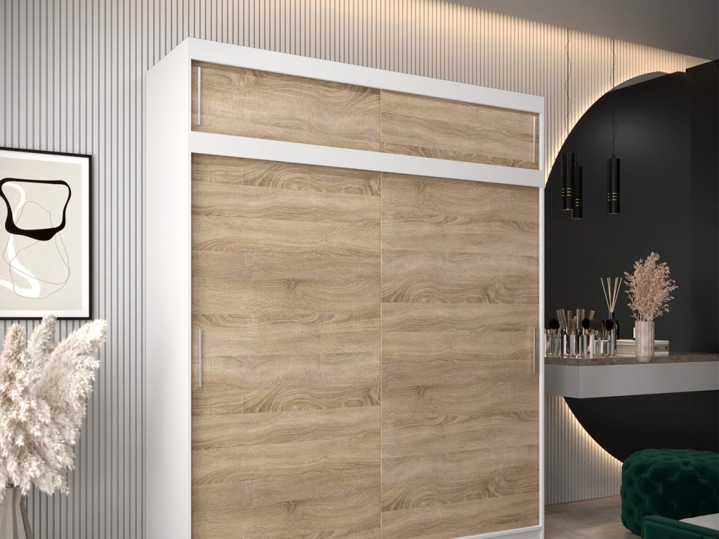 Egyszerű, de igen praktikus felépítmény / felső kiegészítő szekrény, melynek köszönhetően még több tároló helyet kap majd. A felépítmény a a BETHANY, KARIN, KODI, LUPI, MIREL és ALIAS szekrényekhez megfelelő. A szekrényekhez hasonlóan magas minőségű laminált 16 mm vastag bútorlapból készülnek, amely ellenálló a karcolásokkal, a nedvességgel és a magas hőmérséklettel szemben. A fogantyúk pedig PVC-ből készülnek. A BIMAK tolóajtó rendszer biztosítja az ajtók megfelelő működését, amelyek fém vezetősíneken mozognak. A felépítmény két kis szekrényből áll.