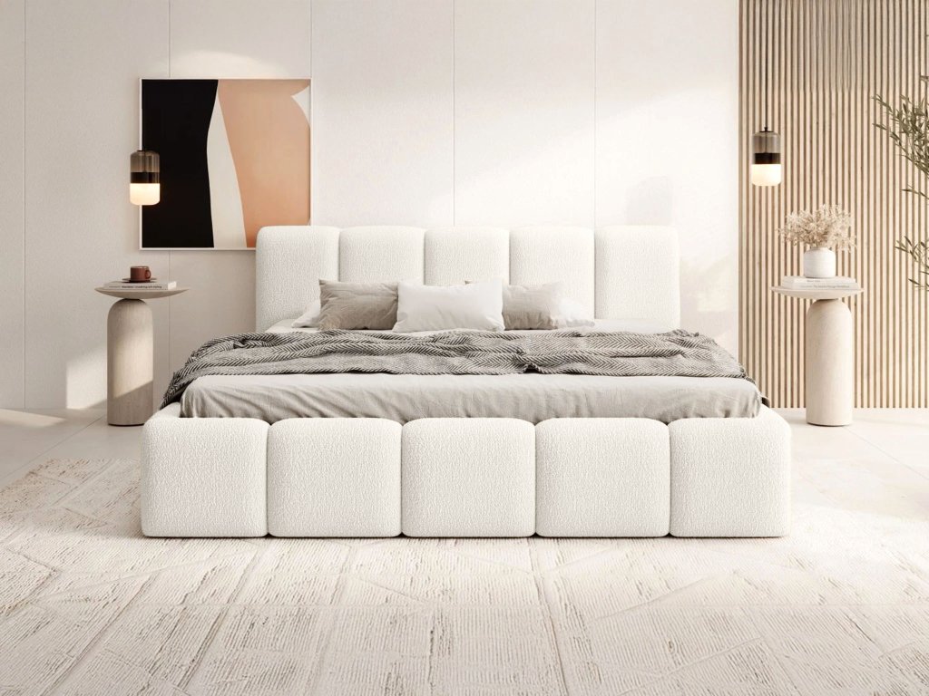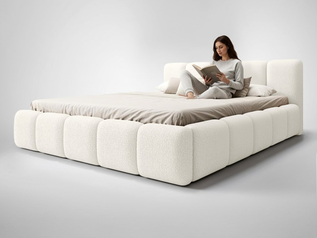 A Feros 160x200 cm-es ágy krémszínű buklé szövettel a hálószoba gyengéd eleganciáját, stílusát és kényelmét testesíti meg. Finoman ívelt vonalai és a magas, kárpitozott ágytámla különleges karaktert adnak a helyiségnek, miközben ideális pihenőhelyet biztosítanak olvasáshoz vagy teljes kikapcsolódáshoz. A masszív fém ágyrács alatt tágas ágyneműtartó található, amely tökéletes a takarók, ágyneműk vagy szezonális ruhák tárolására. A stabil fém szerkezet és a precíz kivitelezés hosszú élettartamot és kényelmes használatot garantálnak.