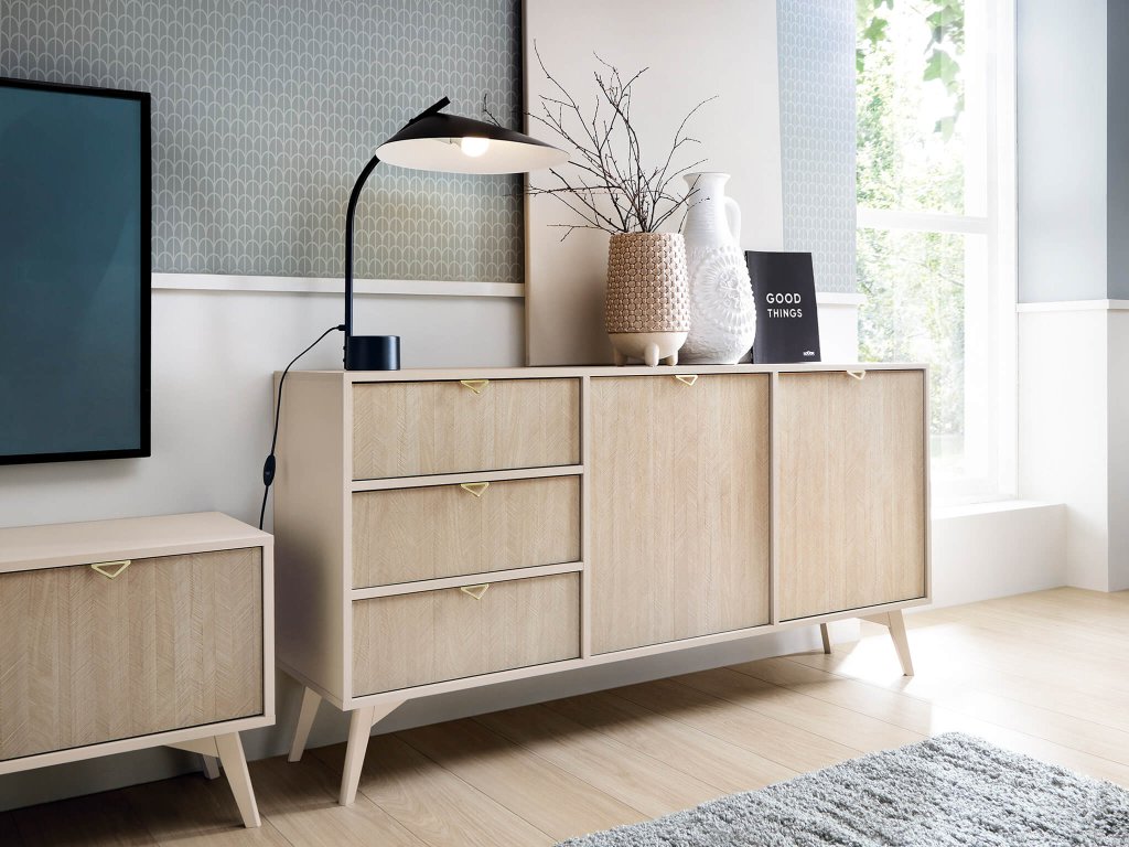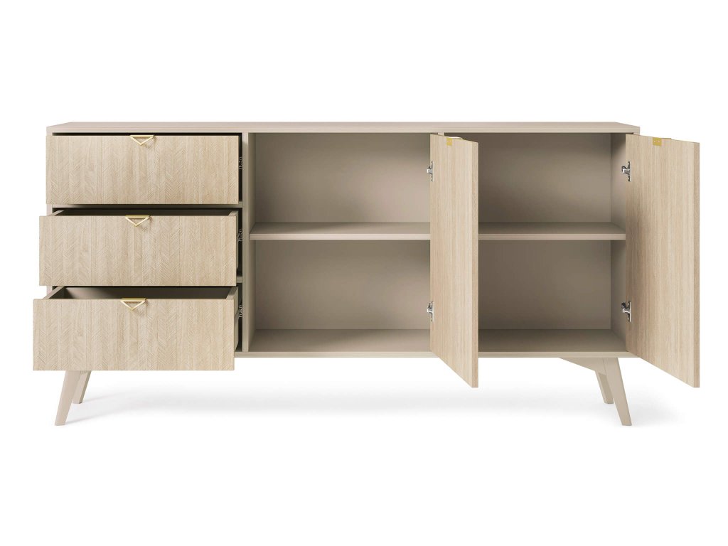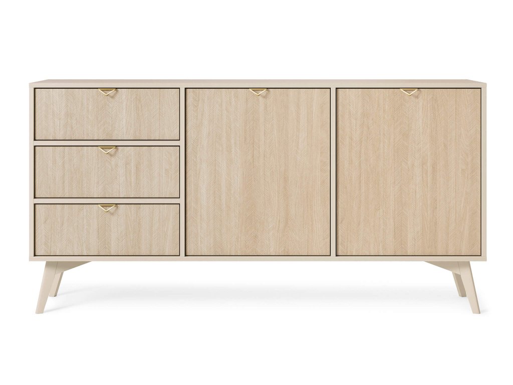 A FOREST kétajtós komód igazán igazán jó választás lehet minden otthonba. Skandináv stílusban készült gyönyörű bútor darab, amely még igazán praktikus is. A 158 centiméteres szélességének köszönöhetően számos tároló helyet biztosít. A komód jobb oldalában a két ajtó mögött egy-egy praktikus polc található. A bal oldalában pedig három fiókot helyeztek el. A laminált bútorlapnak köszönhetően igazán ellenálló. A tömör fa lábak pedig biztosítják a stabilitását. Gyönyörű halszálka mintás komód bézs színben az otthonába.