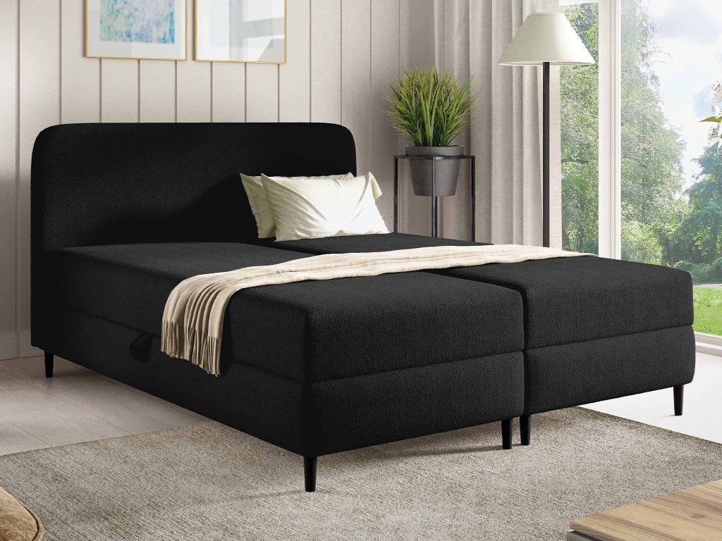 Az ágy fekete Lambi szövettel van kárpitozva, amely első pillantásra lenyűgöz a báránybőr felületével. Ez a szövet luxus hatást kelt, kellemes tapintású, és kiválóan kiegészíti a modern belső tereket. A fekete szín időtálló és praktikus – elegáns hátteret teremt a kiegészítőknek, és könnyen karbantartható tökéletes állapotban. Magas kopásállóságának köszönhetően az ágy megőrzi reprezentatív megjelenését még mindennapi használat mellett is.