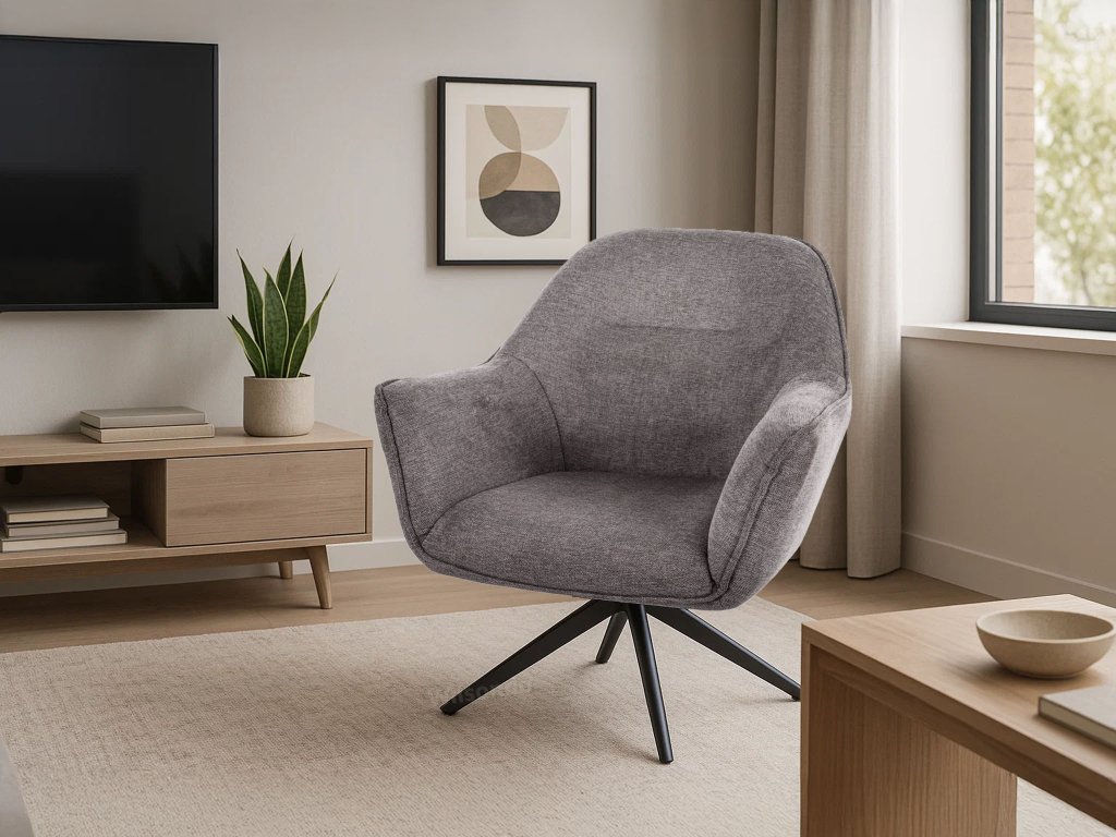 A szürke szövettel kárpitozott GALIA forgófotel egy stílusos és modern bútordarab minden otthonba. Puha, mégis strapabíró szövettel kárpitozott, amely kellemes tapintású, és hosszú távon megőrzi minőségét. A fekete fém lábak biztosítják a stabilitását, miközben kiemelik a fotel elegáns megjelenését. A 360°-ban elforgatható ülőrésznek köszönhetően a fotel sokoldalúan használható. Ideális választás a nappaliba, a dolgozószobába vagy mondjuk az olvasósarokba. Semleges színe és letisztult formája révén könnyen beillik különböző stílusú otthonokba is.