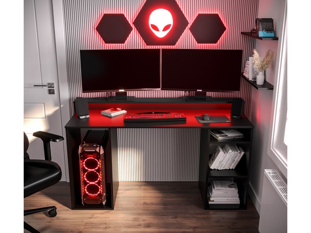 Matt fekete színű praktikus GAMER 1 asztal, amelynek része egy polc is, amelyen kényelmesen elfér egy vagy akár két monitor is. Tökéletes választást jelent minden gyerekszobába, ifjúsági szobába, esetleg dolgozószobába vagy irodába. Jó választás gyerekeknek, akik szeretnek számítógépes játékokat játszani, vagy olyan dolgozóknak, akik otthonról dolgoznak. A számítógépes íróasztal minőségi 16 mm vastag laminált bútorlapból készült, a szélei pedig felületkezelésen mentek át. Ellenállóak a sérülésekkel szemben a 0,5 mm PVC élzárásnak köszönhetően. Az íróasztal része egy nyitott szekrény a számítógépháznak, a másik oldalon pedig három nyitott polc található az iratoknak, könyveknek.