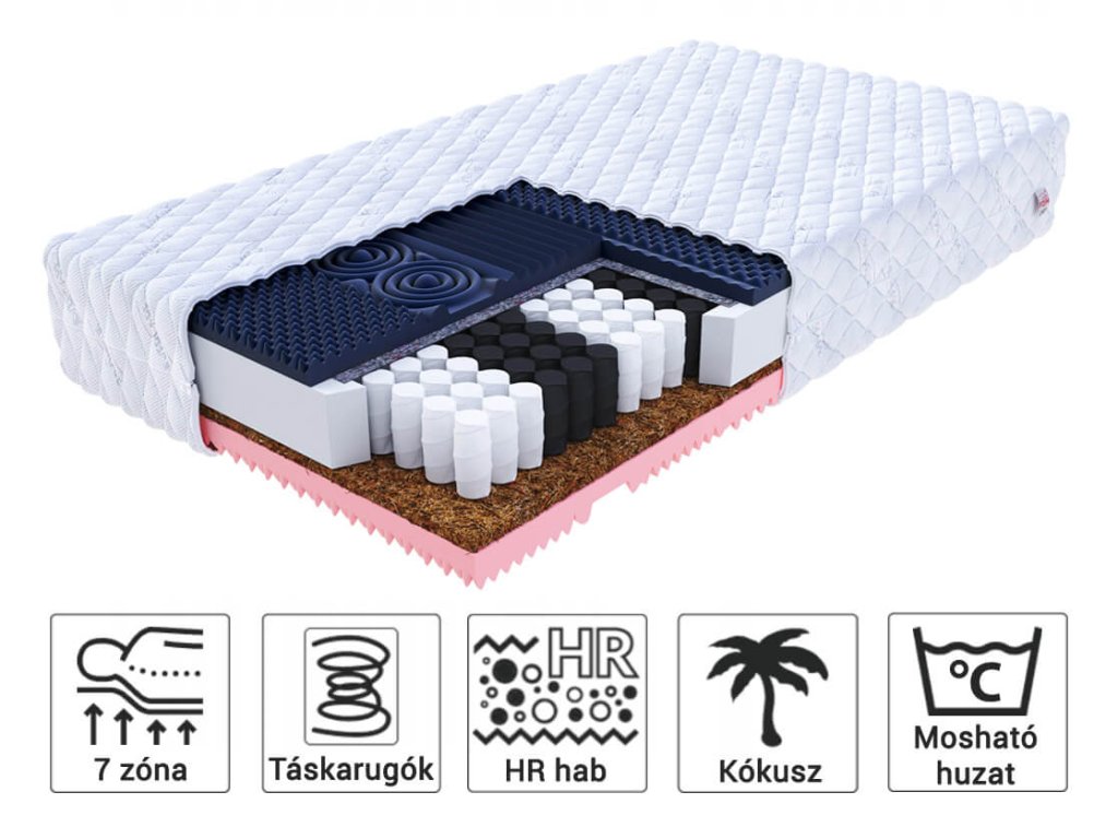 Anyag összetétel: 25 kg/m3 sűrű poliuretán hab, Táskarugók, masszázs HR hideghab, 40 kg/m3 sűrű Visco memóriahab, kókusz, huzat
