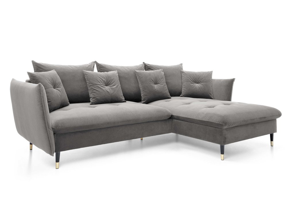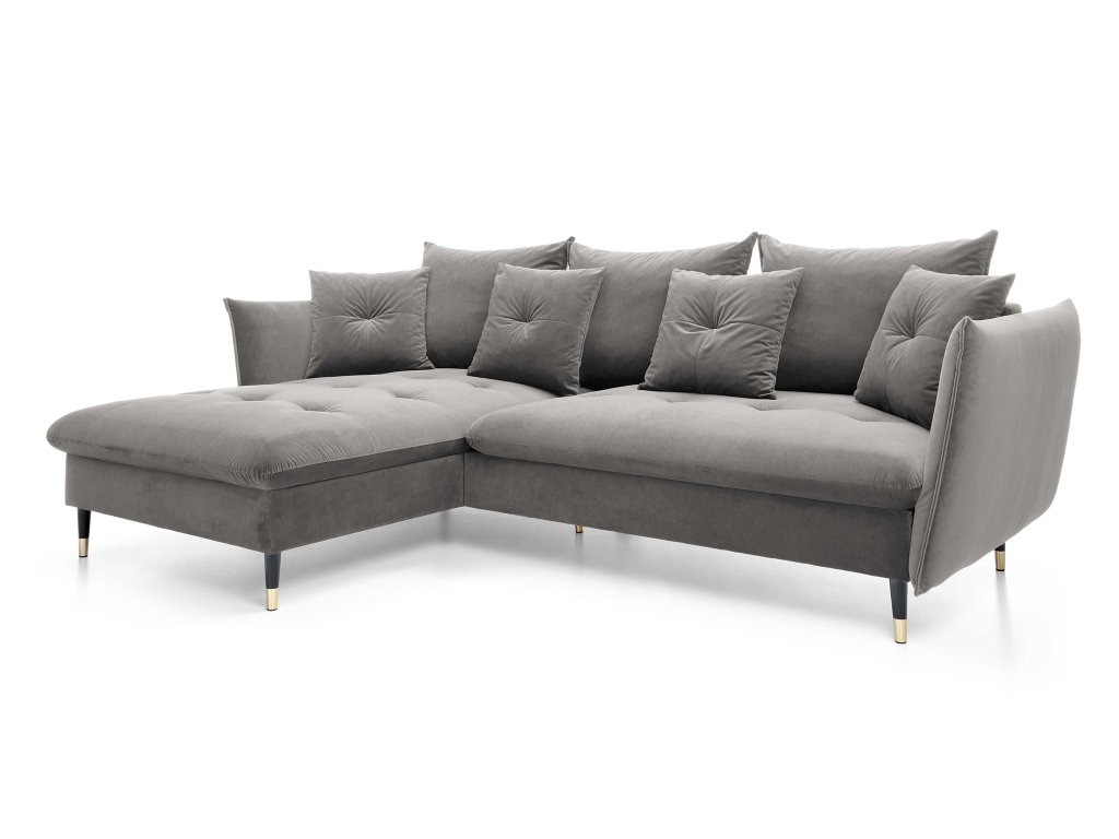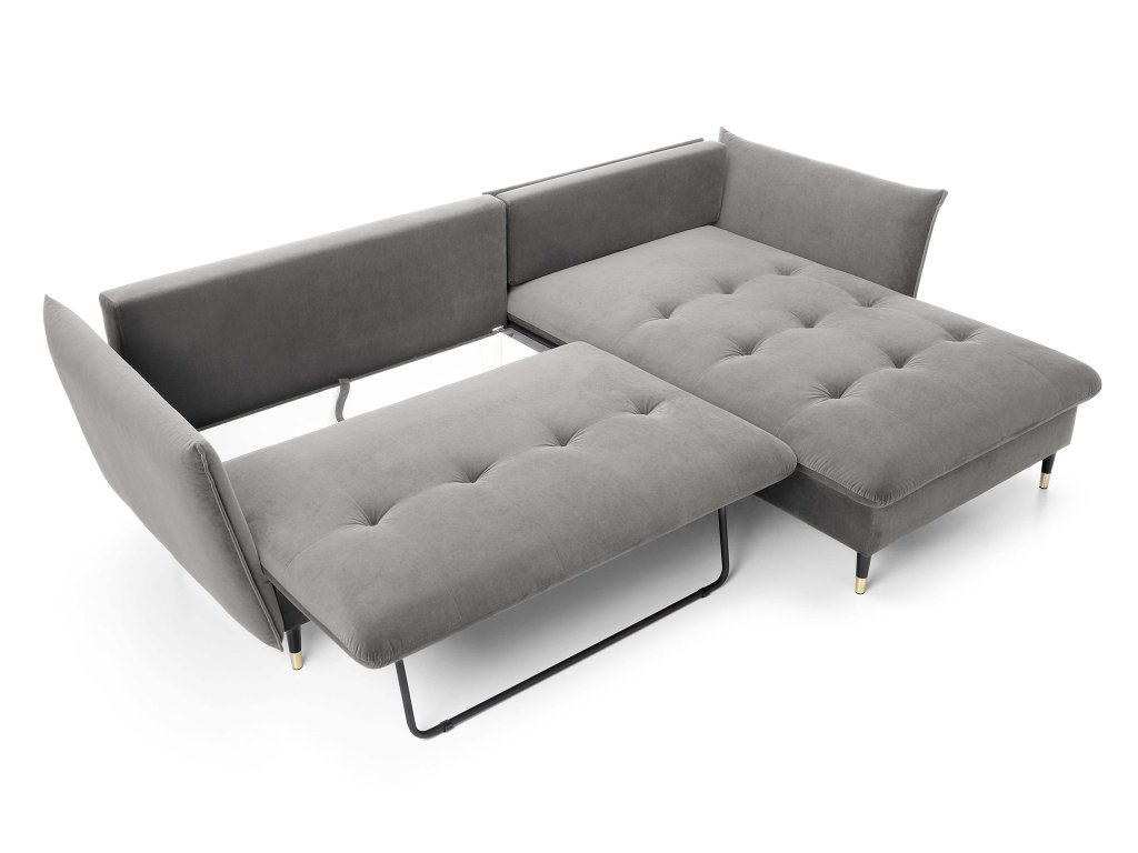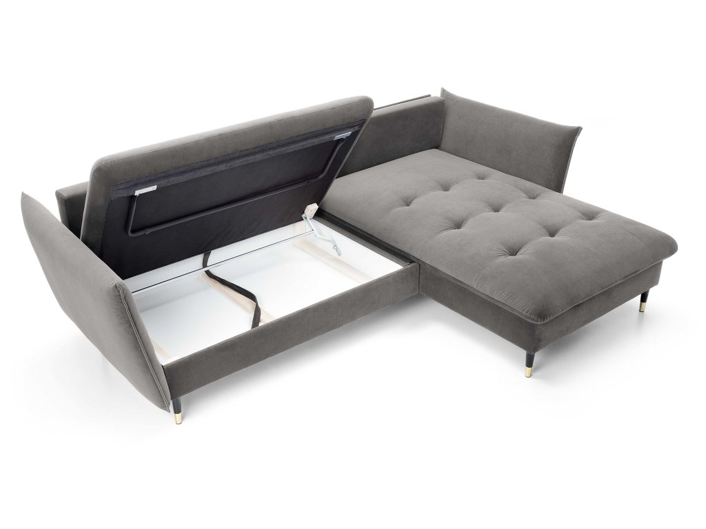 A GLAM L alakú kárpitozott kanapé gyönyörű designnal, kényelmes párnákkal, fekete-arany lábakkal és praktikus ágyneműtartóval rendelkezik. A sarokkanapé Önt és minden vendégét is leveszi majd a lábáról. Ez a gyönyörű ülőgarnitúra négy elegáns színben is elérhető: bézs, zöld, kék és szürke, így ki tudja választani azt, amelyik a legjobban illik az otthonába. A kihúzható kanapé bársonyos Riviera szövettel kárpitozott, amely nem csak kellemes tapintású és puha, de nagyon könnyen tisztán is tartható. Falista hullámrugókból és PUR habból készül, melynek köszönhetően optimális kényelmet és alátámasztást biztosít a pihenéssel eltöltött órákban. A szétnyitható kanapé ráadásul tágas felnyitható ágyneműtartóval is rendelkezik, amely az ülőfelület alatt kapott helyet. Tökéletes helyet biztosít az ágyneműnek, párnáknak, plédeknek. A sarokkanapé elegáns és praktikus kiegészítő minden otthonba. A GLAM ágyazható kanapé szétnyitott állapotban egy 139 x 224 cm méretű fekhellyel rendelkezik. Így ez nem csak egy egyszerű L alakú kanapé, de egy praktikus vendégágy is. A szétnyitható funkciónak köszönhetően ideális mindazok számára, akik gyakran fogadnak vendégeket vagy akik a nappaliban is kényelmesen fekve szeretnek tévézni. Igazán kecses és elegáns fekete-arany fém lábakkal rendelkezik, amelyek biztosítják az igazán luxusos kinézetét és a stabilitását. A GLAM modell két variációban is elérhető: jobbos és balos verzióban, melynek köszönhetően bármelyik nappaliban megállja a helyét.