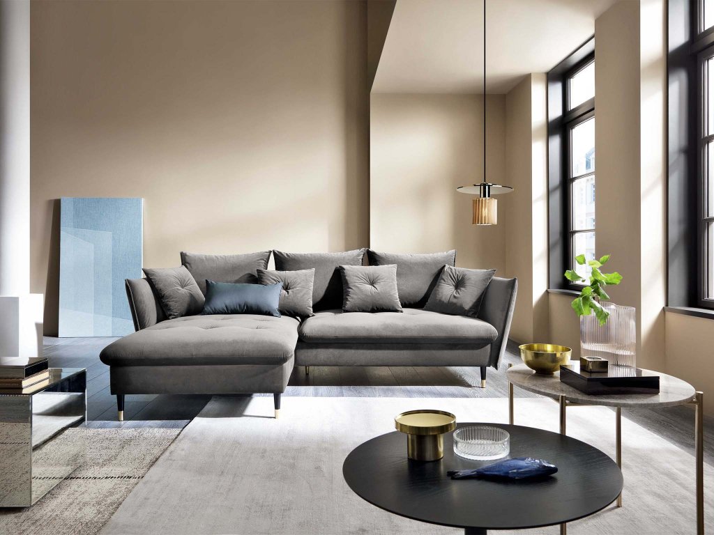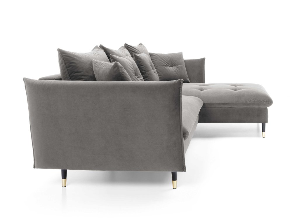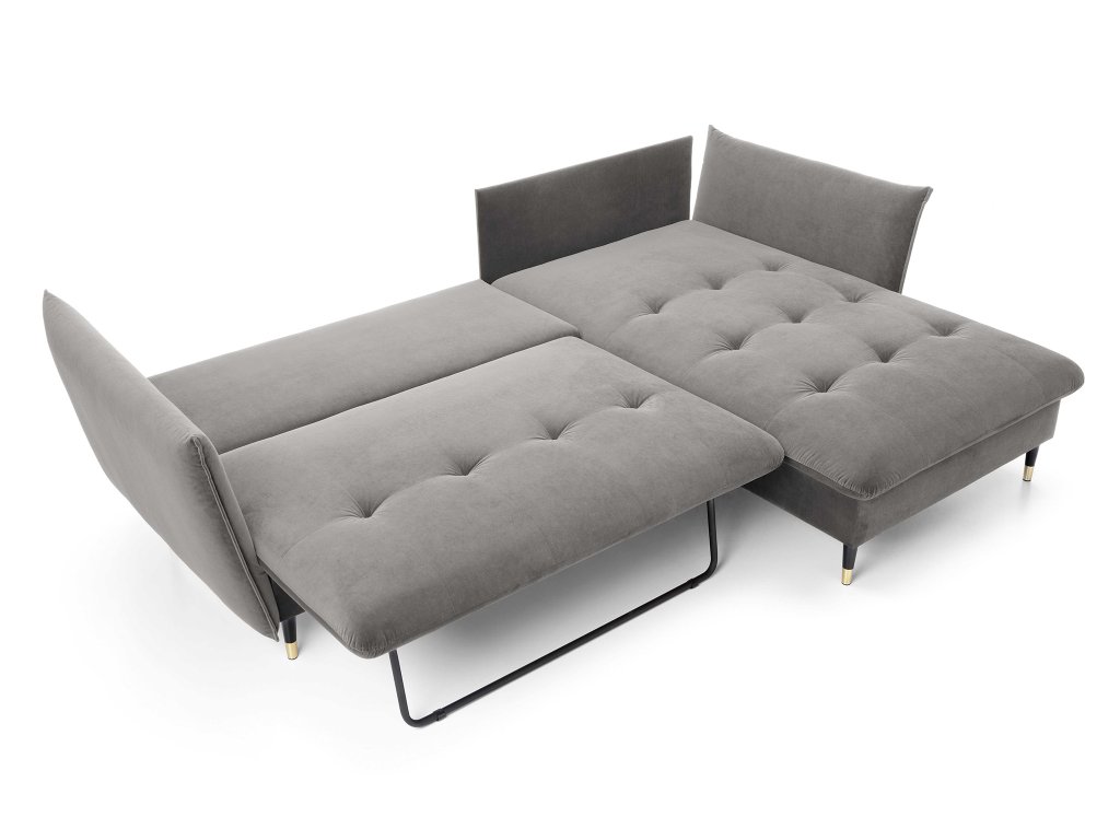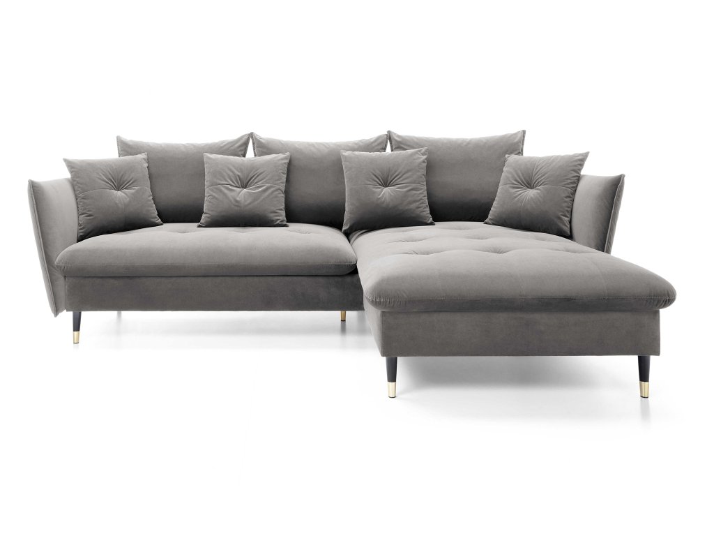 A GLAM L alakú kárpitozott kanapé gyönyörű designnal, kényelmes párnákkal, fekete-arany lábakkal és praktikus ágyneműtartóval rendelkezik. A sarokkanapé Önt és minden vendégét is leveszi majd a lábáról. Ez a gyönyörű ülőgarnitúra négy elegáns színben is elérhető: bézs, zöld, kék és szürke, így ki tudja választani azt, amelyik a legjobban illik az otthonába. A kihúzható kanapé bársonyos Riviera szövettel kárpitozott, amely nem csak kellemes tapintású és puha, de nagyon könnyen tisztán is tartható. Falista hullámrugókból és PUR habból készül, melynek köszönhetően optimális kényelmet és alátámasztást biztosít a pihenéssel eltöltött órákban. A szétnyitható kanapé ráadásul tágas felnyitható ágyneműtartóval is rendelkezik, amely az ülőfelület alatt kapott helyet. Tökéletes helyet biztosít az ágyneműnek, párnáknak, plédeknek. A sarokkanapé elegáns és praktikus kiegészítő minden otthonba. A GLAM ágyazható kanapé szétnyitott állapotban egy 139 x 224 cm méretű fekhellyel rendelkezik. Így ez nem csak egy egyszerű L alakú kanapé, de egy praktikus vendégágy is. A szétnyitható funkciónak köszönhetően ideális mindazok számára, akik gyakran fogadnak vendégeket vagy akik a nappaliban is kényelmesen fekve szeretnek tévézni. Igazán kecses és elegáns fekete-arany fém lábakkal rendelkezik, amelyek biztosítják az igazán luxusos kinézetét és a stabilitását. A GLAM modell két variációban is elérhető: jobbos és balos verzióban, melynek köszönhetően bármelyik nappaliban megállja a helyét.