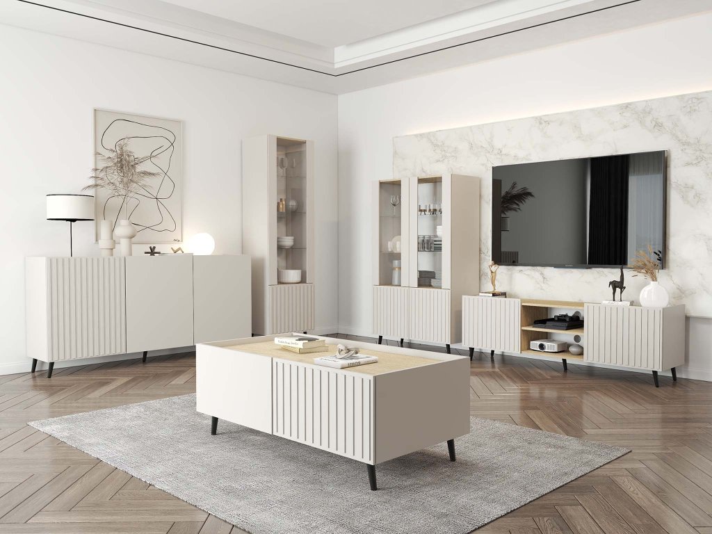 A GOJA nappali bútor garnitúra az elegancia, a funkcionalitás és a modern dizájn tökéletes harmóniáját viszi el az otthonába. A bútorok kiváló minőségű 16 mm vastag laminált bútorlapból készülnek, ami tartósságot és hosszú élettartamot garantál. Az ABS élzárás megóvja a felületet a sérülésektől, és letisztult, esztétikus megjelenést biztosít. A kollekcióba tartozó bútordarabok mart előlapokkal és fogantyú nélküli nyitással rendelkeznek, ami még jobban kiemeli a kollekció minimalista stílusát. A modern fekete fém lábak elegáns megjelenést kölcsönöznek az egész bútorcsaládnak. A GOJA bútor szett két kifinomult színváltozatban érhető el – mélyfekete és lágy kasmír színekben. Sokoldalú kihasználhatóságának és az elegáns megjelenésének köszönhetően az egyes darabot tökéletesen illenek úgy a modern, mind a klasszikus otthonokba, ahol harmonikus és meghitt hangulatot teremtenek. Az egyes bútordarabok nem csak a nappaliban, de az előszobában, az étkezőben vagy a hálószobában is megállják a helyüket.