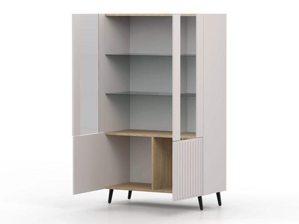 A kasmír színű gyönyörű GOJA 2D kétajtós vitrines szekrény otthona dísze lesz majd. Elhelyezheti az étkezőbe vagy a nappaliba is. A kétszárnyú részben üveges ajtó mögött két széles üvegpolc található, amelyek tökéletesen alkalmasak dísztárgyak, étkészlet vagy személyes emléktárgyak ízléses elhelyezésére. Az alsó kis szekrény elegendő helyet kínál mindannak, amit szeretne kéznél tartani, de nem szeretné, hogy szem előtt legyen. A matt kasmír felület és a Cremona tölgy elemek harmonikus kontrasztja elegáns és modern hatást kelt. A karcsú fém lábak nemcsak stabilitást biztosítanak, hanem könnyedséget és modern megjelenést is kölcsönöznek a bútornak. A Goja 2D vitrin tökéletes választás mindazok számára, akik értékelik a stílusos megjelenést és a praktikus funkciókat..