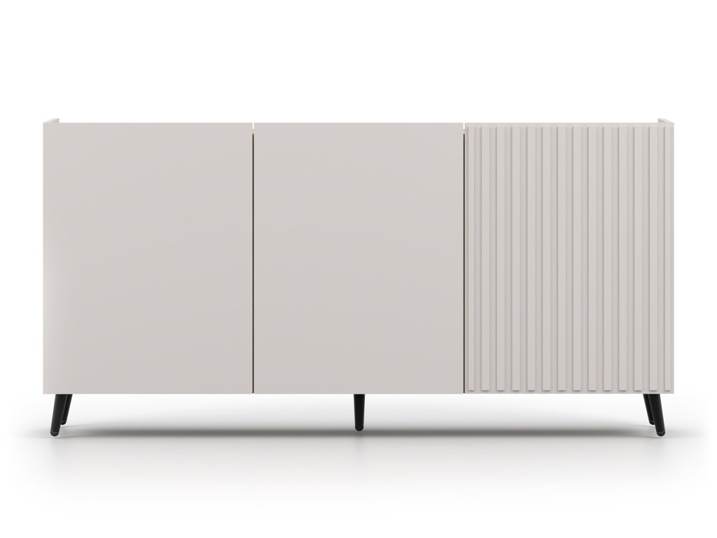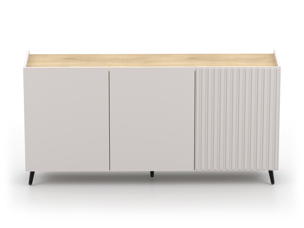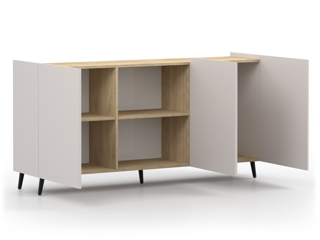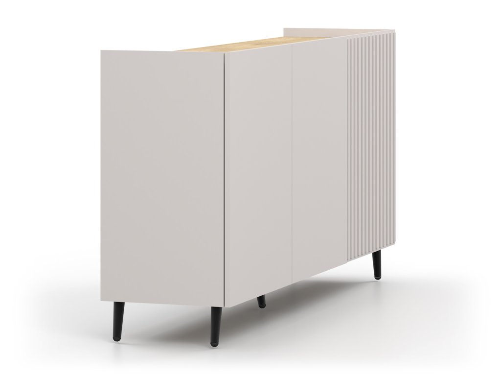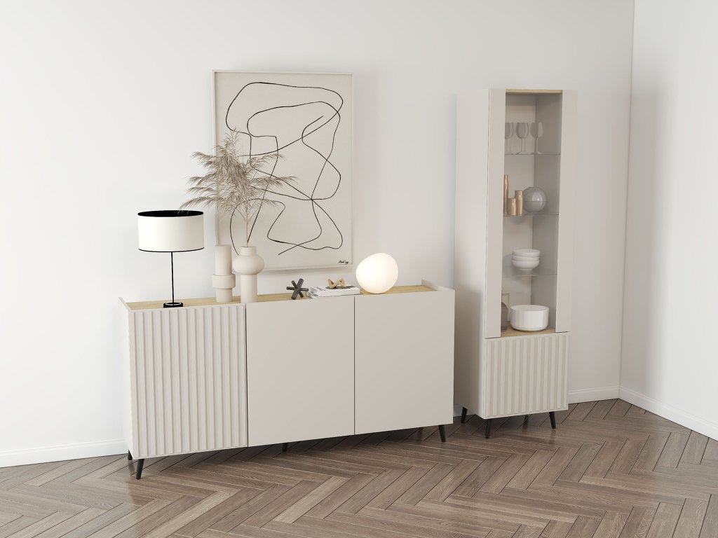 A kasmír színű GOJA komód a stílusos megjelenést ötvözi a mindennapokban is praktikus tárolási megoldásokkal. A három tágas szekrény polcokkal rendelkezik és bőséges helyet kínál a ruhák, iratok vagy a nappaliba szánt kiegészítők számára. A kasmír színű mart előlaphoz szépen illenek a Cremona tölgy színű részletek, amelyek finom melegséget és természetes kontrasztot visznek a szobába. A fogantyú nélküli kialakítás letisztult, modern és időtálló megjelenést ad a komódnak, így könnyedén illeszkedik a minimalista stílustól kezdve egészen az ipari stílusú enteriőrökig.