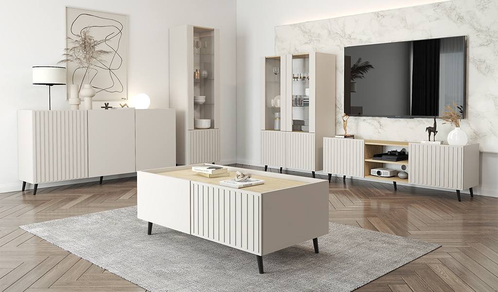A GOJA bútor szett két kifinomult színváltozatban érhető el – mélyfekete és lágy kasmír színekben. Sokoldalú kihasználhatóságának és az elegáns megjelenésének köszönhetően az egyes darabot tökéletesen illenek úgy a modern, mind a klasszikus otthonokba, ahol harmonikus és meghitt hangulatot teremtenek.