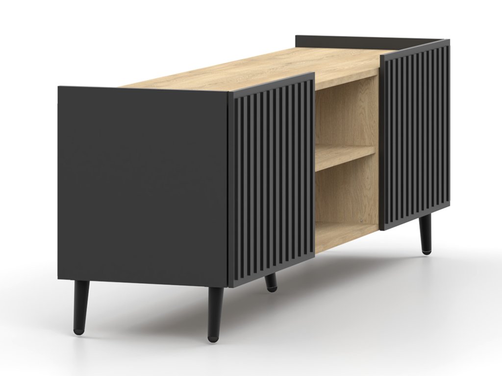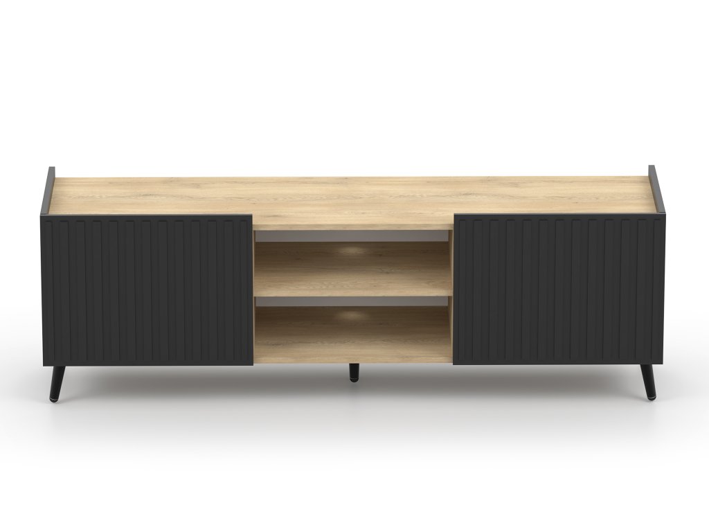 A fekete GOJA tévés asztal az elegáns formatervezést és a praktikus megoldásokat ötvözi. Tökéletesen illeszkedik a modern és a klasszikus stílusú nappalikhoz is. A két egyajtós szekrény és a két nyitott polc elegendő helyet biztosít a TV tartozékainak, játékkonzoloknak vagy dekorációs kiegészítőknek. A matt fekete felület és a Cremona tölgy elemek harmonikus kontrasztja elegáns és modern hatást kelt. A karcsú fém lábak nemcsak stabilitást biztosítanak, hanem könnyedséget és modern megjelenést is kölcsönöznek a bútornak. A mart előlapok, a fogantyú nélküli nyitás és a karcsú fém lábak a modern, letisztult stílust hangsúlyozzák. A Goja TV-szekrény a nappali praktikus és esztétikus központi elemévé válik.