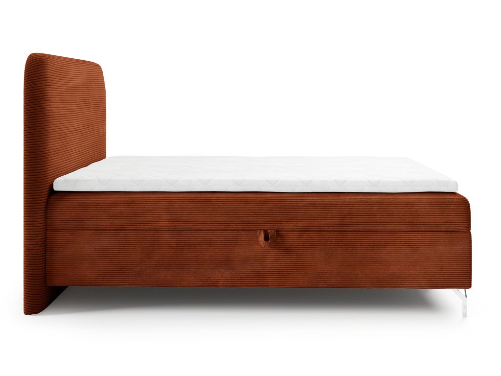 Tegye még szebbé a hálószobáját a nem mindennapi téglavörös színváltozatban készült GOMEZ boxspring ággyal 120x200 cm. Ez az egyszemélyes ágy tökéletes választás nem csak a kisebb hálószobákba, de a vendégszobába vagy a kamaszok ifjúsági szobájába is. Az ágy elegáns Poso szövettel kárpitozott, amely a manchester szövetek közé tartozik, nagyon kellemes tapintású és puha. A magas puha háttámla jó szolgálatot tesz az esti olvasás vagy tévénézés közben. Az egész ágy igazi luxust és kényelmet kínál.
