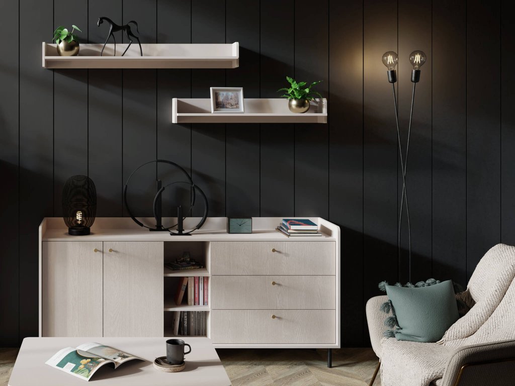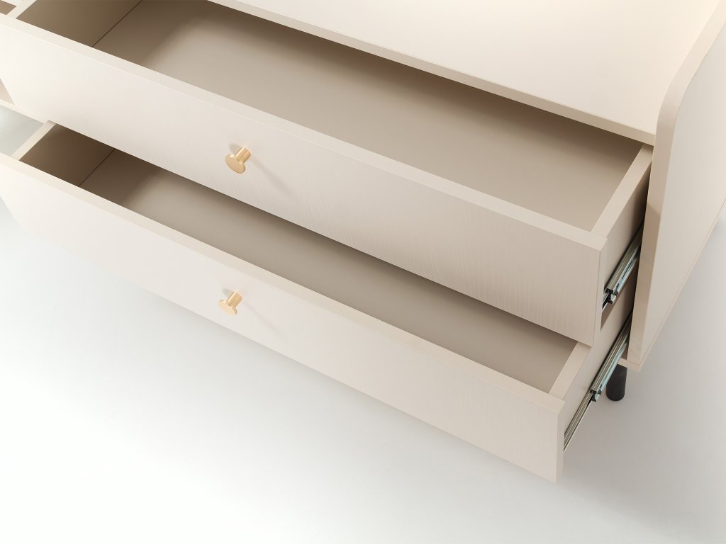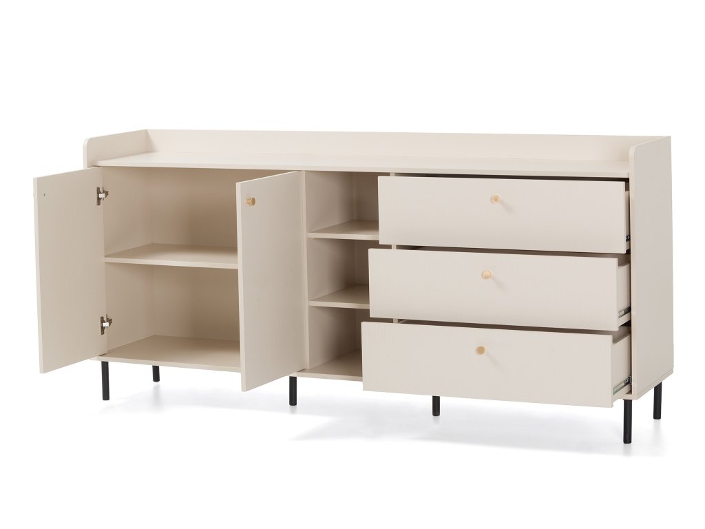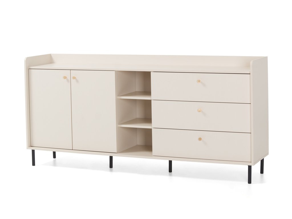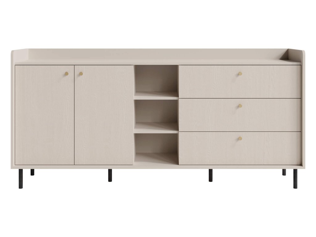 A GRANDE 193 cm széles komód tökéletes választás lesz a nappaliba vagy a hálószobába. Számtalan funkciója és előnye van. Nemcsak rápakolhatunk, hanem belső részébe is rámolhatunk bármit. Tartalmaz kétajtós szekrényt, három nyitott polcot és három fiókot. A világos homokszínben kapható tároló szekrény ragyogóvá varázsolja a helyiséget, ráadásul tágasabbnak mutatja a teret. A modern sifonér gyártása során sima és faerezetű laminált bútorlapok kombinációja került felhasználásra. Ha Önnek egy kisebb komódra van szüksége, a GRANDE kollekcióban két keskenyebb változatot is talál 103 és 153 cm méretben.