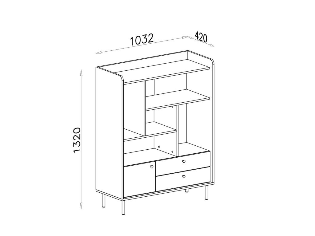 Az elegáns GRANDE könyvespolc öt különböző méretű nyitott polcot, egy kisebb szekrényt és két fiókot tartalmaz. A könyvek tárolása mellett a szekrény tetején biztonságban elhelyezhető a virágcserép és a váza is. A könyvszekrény minőségi laminált bútorlapból gyártott és fémből készült arany bútorgombokkal és fekete lábakkal rendelkezik.