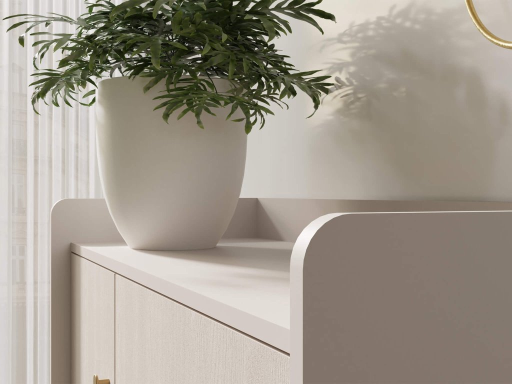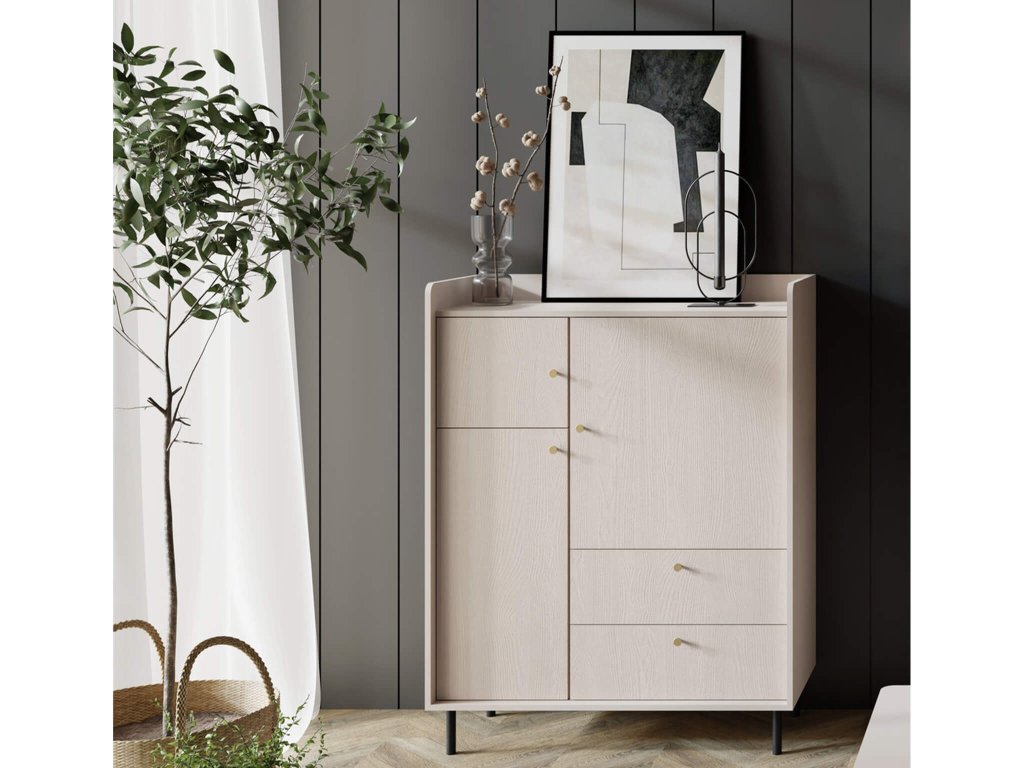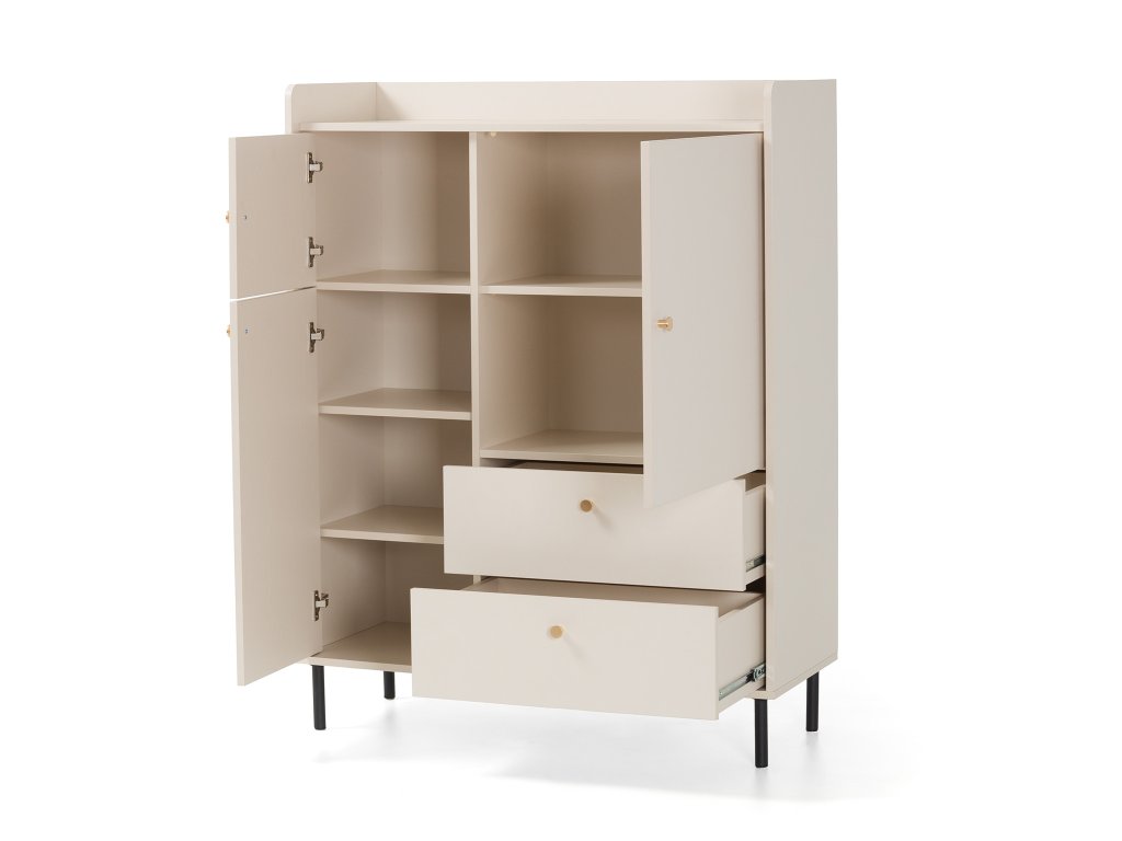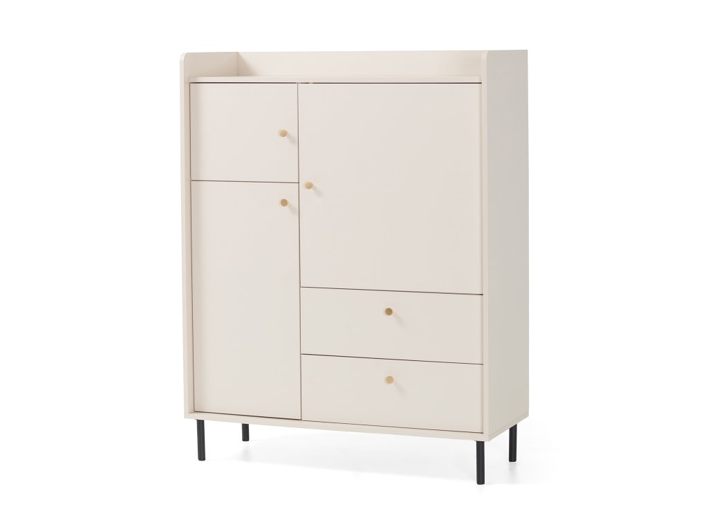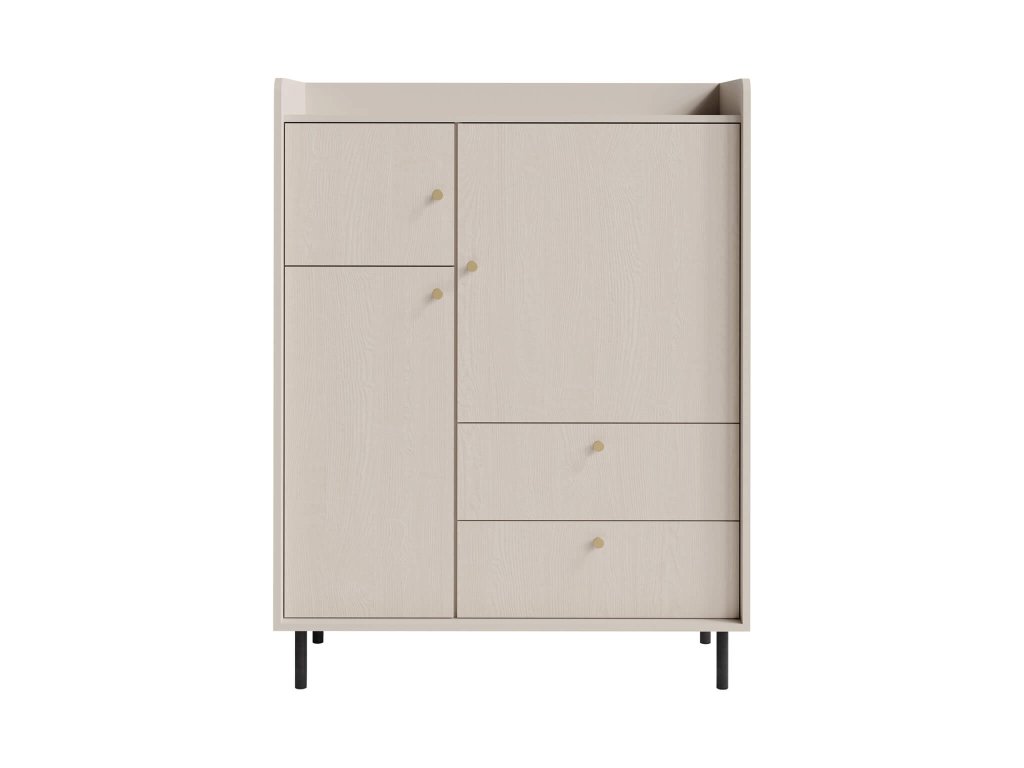 Világos nappali bútorról álmodozik? A világos bútor amellett, hogy nagyon szép, időtlen is, ráadásul tágítja a belső teret. A GRANDE magas komód három különféle szekrénnyel és két fiókkal rendelkezik, így rengeteg tárolóhelyet biztosít iratok, poharak vagy családi fotóalbumok számára. A fiókos szekrény kiváló minőségű sima és fa felületi struktúrával rendelkező laminált bútorlapok kombinációjából tevődik össze. Mindezt fémből készült aranyszínű bútorgombok és fekete lábak egészítenek ki. A GRANDE bútorcsalád elemei között alacsony komódok is megtalálhatóak különböző szélességben az Ön igényeinek és elvárásainak függvényében.