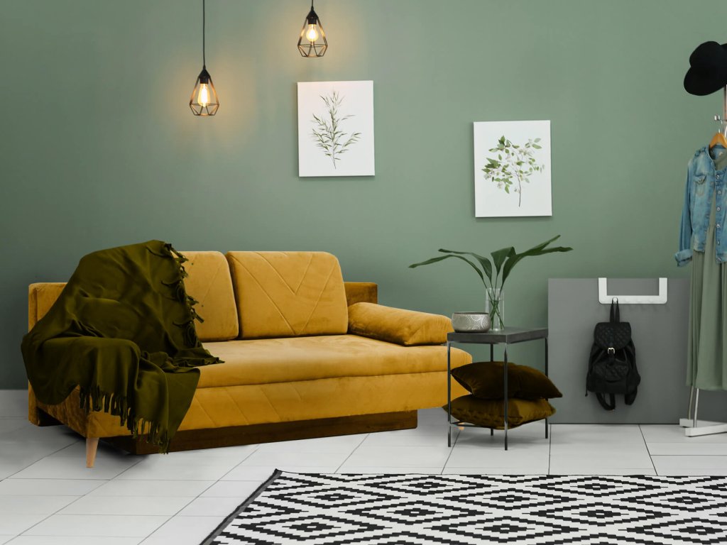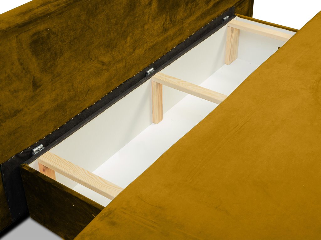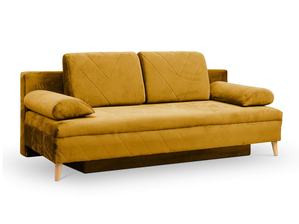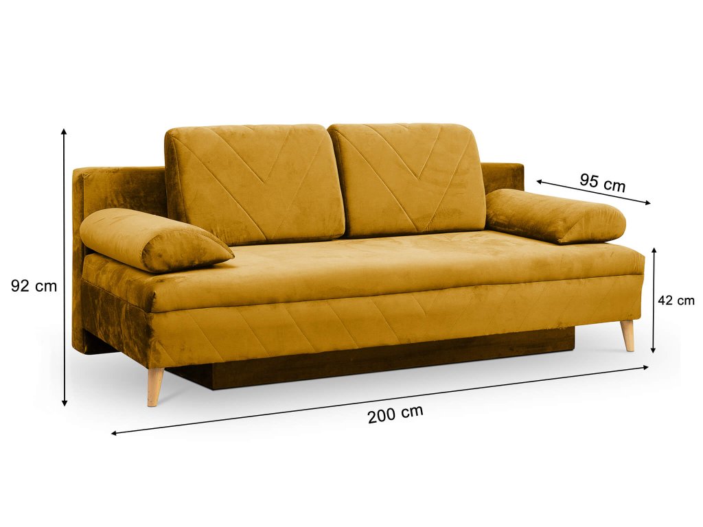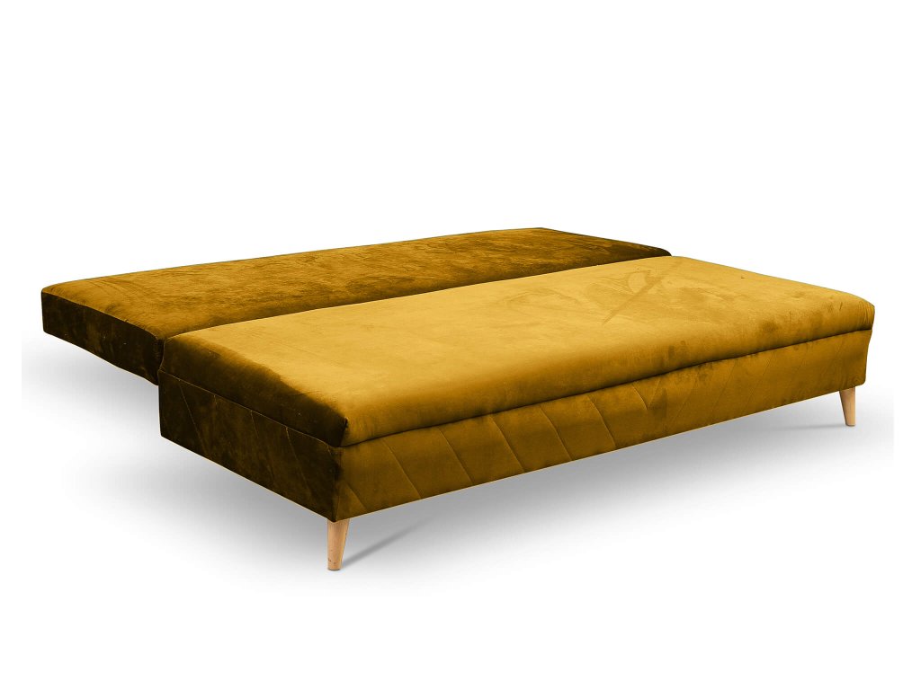Gyönyörű és nem mindennapi kanapéágyat keres? A mustársárga GRANDIA egy stílusos kanapéágy, amely megtalálja a helyét minden modern vagy klasszikus nappaliban. Azonban tökéletes választás lehet a konyhába vagy az étkezőbe is. A kanapét könnyen szétnyithatja és egy kényelmes fekhelyet hozhat létre.Az ülőfelület Falista hullámrugókból és 8 cm vastag molitánból készül. A háttámla szintén molitán töltettel rendelkezik. Ide lefekhet egy kicsit pihenni és sziesztázni a finom ebéd után. A kanapéágy belseje egy praktikus tároló helyet is rejt. A kényelméhez hozzájárul a két gyönyörűen steppelt háttámaszként szolgáló párna és két kisebb, a kanapé oldalában található, párna is. A kihúzható kanapé ellenálló és kellemes bársonyos mustársárga velúr szövettel kárpitozott. A kanapé tömör fa lábakkal rendelkezik natúr színben. A kanapéágy kanapéként és ideiglenes vendégágyként is használható. Tökéletes szolgálatot tesz minden otthonban.