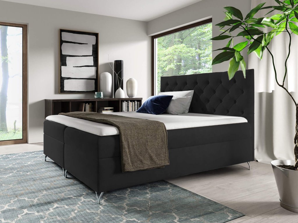 Hihetetlenül elegáns és luxusos hatás keltő fekete Guliette kárpitozott boxspring franciaágy. Az ágy luxusos hatását növelik a fém lábak is. A kontinentális ágy ágyneműtartókkal is rendelkezik, ahová kényelmesen elfér az ágynemű. Két tárolóból áll, amelyek egyszerű rúgós rendszerrel működnek és az ágy oldaláról felnyithatók. Az ágy saját beépített ágyráccsal és matraccal is rendelkezik. A beépített matrac minőségi Bonell rugókból áll és T30 magas rugalmasságú habból. A Bonell rugók a leginkább használt rugók a matracok gyártására. Specifikus formájuk és erejük van, amely megfelelő alátámasztást biztosít terhelés esetén. Továbbá lehetővé teszi a matracban a levegő megfelelő áramlását. A magas rugalmasságú T30-as hab megfelelő puhasággal, rugalmassággal és hosszú élettartammal rendelkezik. A fedőmatrac (Topper) magas rugalmasságú habból készült, amely reagál a test hőjére és minden mozdulatára. Rugalmasságot és puhaságotbiztosít, melynek köszönhetően kényelmesen tud pihenni az egész éjszaka során. A Topper 5 centiméter vastag habból áll és ajánlatos 2-3 havonta megfordítani. A levehető huzat cipzáras és mosógépben mosható 30 °C-on. A kidolgozott, steppelt ágytámla stílusos gombokkal díszített. A magas háttámlának praktikus előnyei is vannak, tökéletes szolgálatot tesz könyvolvasáskor vagy tévénézés közben. Az amerikai ágy magas, melynek köszönhetően könnyű róla lekelni.