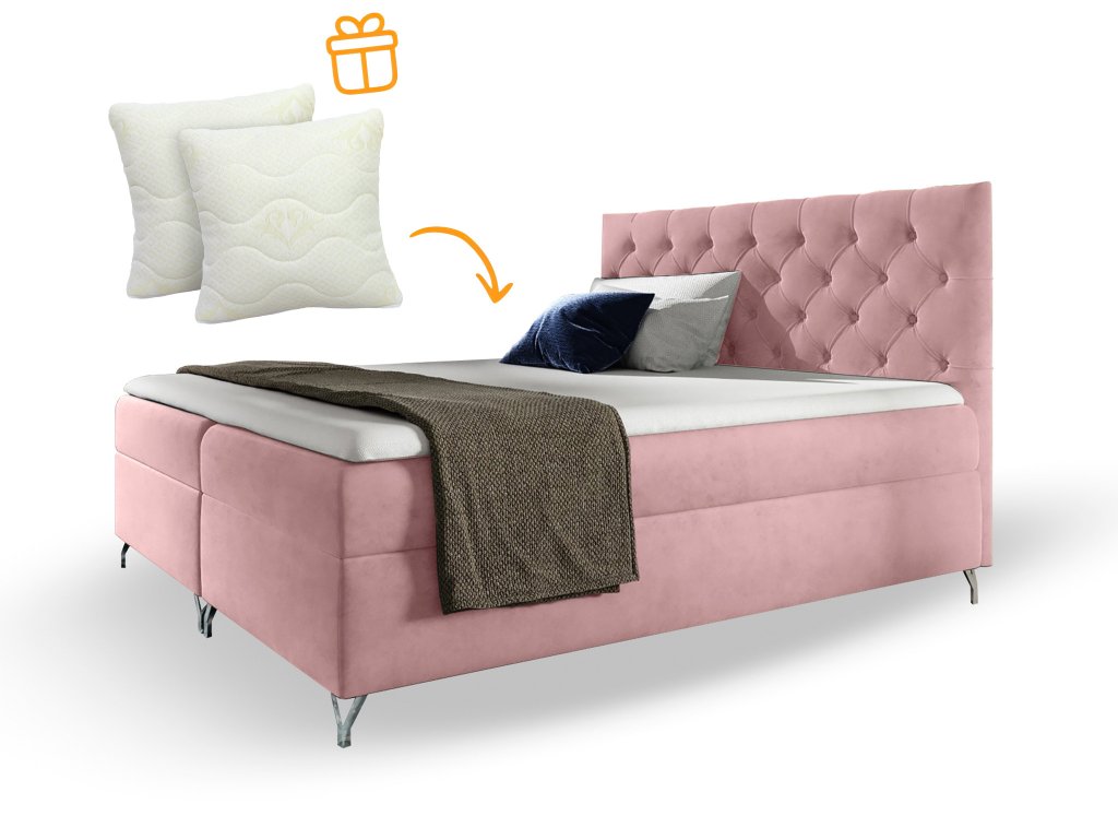 Guliette rózsaszín boxspring ágy 160x200 magas steppelt háttámlával. Az ágy luxusos hatását növelik a fém lábak is. A kontinentális ágy ágyneműtartókkal is rendelkezik, ahová kényelmesen elfér az ágynemű. Két tárolóból áll, amelyek egyszerű rúgós rendszerrel működnek és az ágy oldaláról felnyithatók. Az ágy saját beépített ágyráccsal és matraccal is rendelkezik. A beépített matrac minőségi Bonell rugókból áll és T30 magas rugalmasságú habból. A Bonell rugók a leginkább használt rugók a matracok gyártására. Specifikus formájuk és erejük van, amely megfelelő alátámasztást biztosít terhelés esetén. Továbbá lehetővé teszi a matracban a levegő megfelelő áramlását. A magas rugalmasságú T30-as hab megfelelő puhasággal, rugalmassággal és hosszú élettartammal rendelkezik. A fedőmatrac (Topper) magas rugalmasságú habból készült, amely reagál a test hőjére és minden mozdulatára. Rugalmasságot és puhaságotbiztosít, melynek köszönhetően kényelmesen tud pihenni az egész éjszaka során. A Topper 5 centiméter vastag habból áll és ajánlatos 2-3 havonta megfordítani. A levehető huzat cipzáras és mosógépben mosható 30 °C-on. A kidolgozott, steppelt ágytámla stílusos gombokkal díszített. A magas háttámlának praktikus előnyei is vannak, tökéletes szolgálatot tesz könyvolvasáskor vagy tévénézés közben. Az amerikai ágy magas, melynek köszönhetően könnyű róla lekelni.