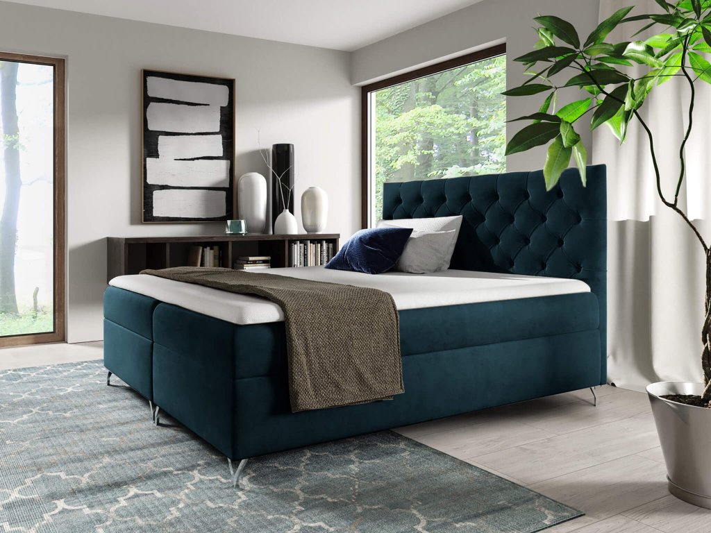 A sötétkék Guliette kárpitozott boxspring ágy 160x200 egy minőségi és gyönyörű bútordarab minden hálószobába. Az ágy luxusos hatását növelik a fém lábak is. A kontinentális ágy ágyneműtartókkal is rendelkezik, ahová kényelmesen elfér az ágynemű. Két tárolóból áll, amelyek egyszerű rúgós rendszerrel működnek és az ágy oldaláról felnyithatók. Az ágy saját beépített ágyráccsal és matraccal is rendelkezik. A beépített matrac minőségi Bonell rugókból áll és T30 magas rugalmasságú habból. A Bonell rugók a leginkább használt rugók a matracok gyártására. Specifikus formájuk és erejük van, amely megfelelő alátámasztást biztosít terhelés esetén. Továbbá lehetővé teszi a matracban a levegő megfelelő áramlását. A magas rugalmasságú T30-as hab megfelelő puhasággal, rugalmassággal és hosszú élettartammal rendelkezik. A fedőmatrac (Topper) magas rugalmasságú habból készült, amely reagál a test hőjére és minden mozdulatára. Rugalmasságot és puhaságotbiztosít, melynek köszönhetően kényelmesen tud pihenni az egész éjszaka során. A Topper 5 centiméter vastag habból áll és ajánlatos 2-3 havonta megfordítani. A levehető huzat cipzáras és mosógépben mosható 30 °C-on. A kidolgozott, steppelt ágytámla stílusos gombokkal díszített. A magas háttámlának praktikus előnyei is vannak, tökéletes szolgálatot tesz könyvolvasáskor vagy tévénézés közben. Az amerikai ágy magas, melynek köszönhetően könnyű róla lekelni.