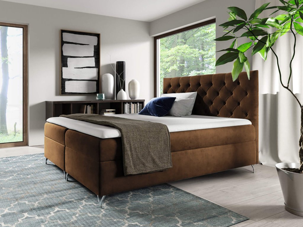 Minden hálószobába tökéletes bársonyos velvet szövettel kárpitozott barna Guliette boxspring ágy. Az ágy luxusos hatását növelik a fém lábak is. A kontinentális ágy ágyneműtartókkal is rendelkezik, ahová kényelmesen elfér az ágynemű. Két tárolóból áll, amelyek egyszerű rúgós rendszerrel működnek és az ágy oldaláról felnyithatók. Az ágy saját beépített ágyráccsal és matraccal is rendelkezik. A beépített matrac minőségi Bonell rugókból áll és T30 magas rugalmasságú habból. A Bonell rugók a leginkább használt rugók a matracok gyártására. Specifikus formájuk és erejük van, amely megfelelő alátámasztást biztosít terhelés esetén. Továbbá lehetővé teszi a matracban a levegő megfelelő áramlását. A magas rugalmasságú T30-as hab megfelelő puhasággal, rugalmassággal és hosszú élettartammal rendelkezik. A fedőmatrac (Topper) magas rugalmasságú habból készült, amely reagál a test hőjére és minden mozdulatára. Rugalmasságot és puhaságotbiztosít, melynek köszönhetően kényelmesen tud pihenni az egész éjszaka során. A Topper 5 centiméter vastag habból áll és ajánlatos 2-3 havonta megfordítani. A levehető huzat cipzáras és mosógépben mosható 30 °C-on. A kidolgozott, steppelt ágytámla stílusos gombokkal díszített. A magas háttámlának praktikus előnyei is vannak, tökéletes szolgálatot tesz könyvolvasáskor vagy tévénézés közben. Az amerikai ágy magas, melynek köszönhetően könnyű róla lekelni.