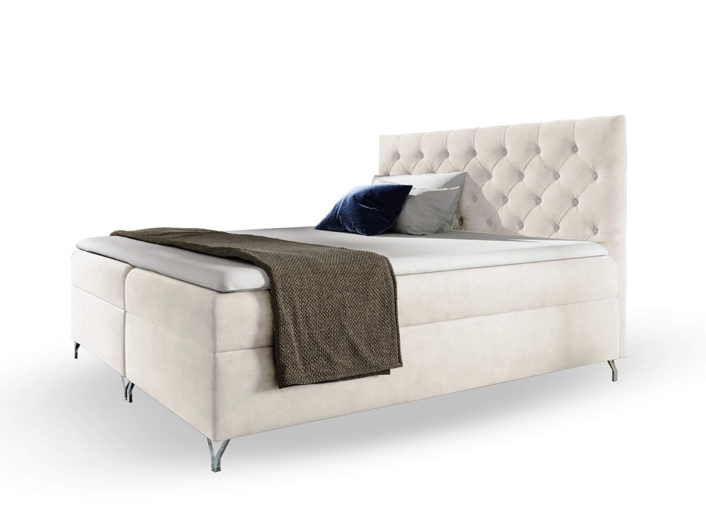 Guliette boxspring franciaágy 180x200 fehér színben, bársonyos szövettel kárpitozva, modern fém lábakkal. Ez a stílusos ágy minden hálószobába tökéletes választás. A kontinentális ágy ágyneműtartókkal is rendelkezik, ahová kényelmesen elfér az ágynemű. Két tárolóból áll, amelyek egyszerű rúgós rendszerrel működnek és az ágy oldaláról felnyithatók. Az ágy saját beépített ágyráccsal és matraccal is rendelkezik. A beépített matrac minőségi Bonell rugókból áll és T30 magas rugalmasságú habból. A Bonell rugók a leginkább használt rugók a matracok gyártására. Specifikus formájuk és erejük van, amely megfelelő alátámasztást biztosít terhelés esetén. Továbbá lehetővé teszi a matracban a levegő megfelelő áramlását. A magas rugalmasságú T30-as hab megfelelő puhasággal, rugalmassággal és hosszú élettartammal rendelkezik. A fedőmatrac (Topper) magas rugalmasságú habból készült, amely reagál a test hőjére és minden mozdulatára. Rugalmasságot és puhaságot biztosít, melynek köszönhetően kényelmesen tud pihenni az egész éjszaka során. A Topper 5 centiméter vastag habból áll és ajánlatos 2-3 havonta megfordítani. A levehető huzat cipzáras és mosógépben mosható 30 °C-on. A kidolgozott, steppelt ágytámla stílusos gombokkal díszített. A magas háttámlának praktikus előnyei is vannak, tökéletes szolgálatot tesz könyvolvasáskor vagy tévénézés közben. Az amerikai ágy magas, melynek köszönhetően könnyű róla lekelni.