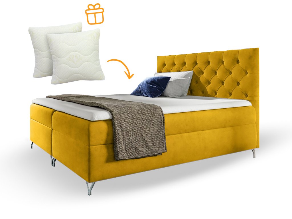 A boxspring ágy Magic velvet 2234 szövettel kárpitozott, amely puha, bársonyos és kellemes tapintású. Ez az anyag ellenálló a kikopással szemben és nem bolyhozódik. A mustársárga kontinentális ágy eleganciát visz minden hálószobába.
