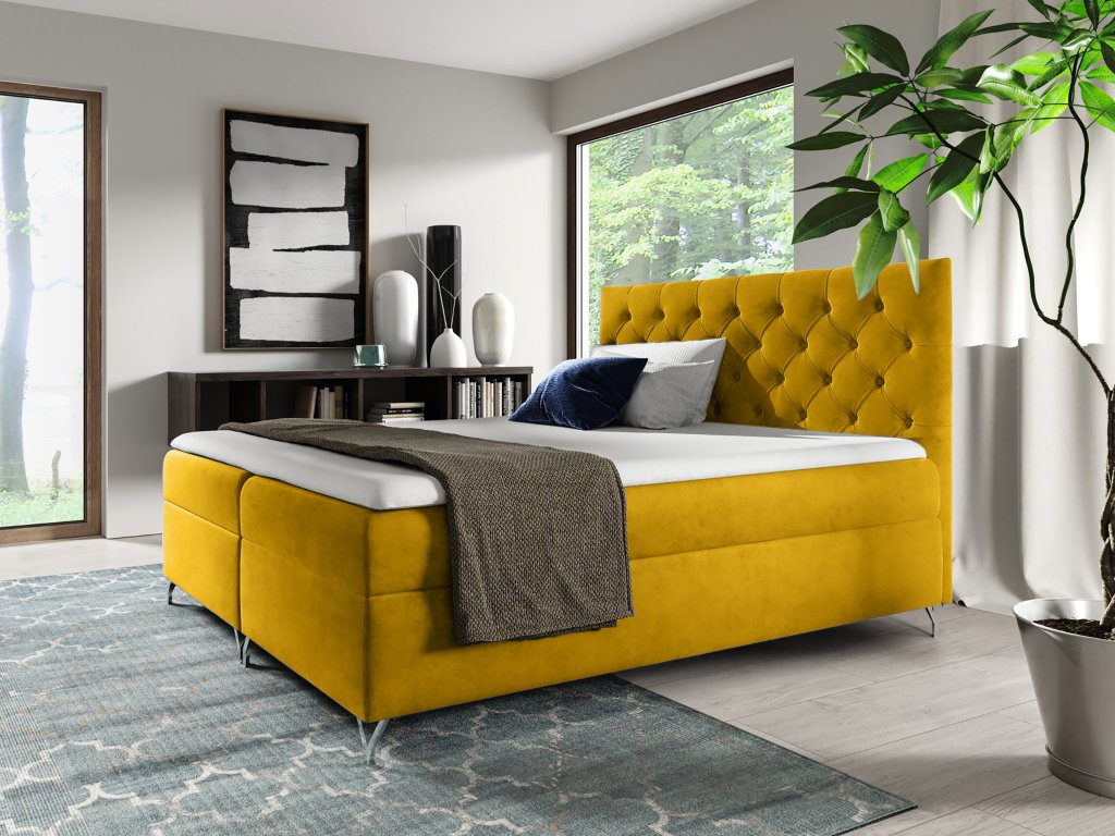 Magas kárpitozott háttámlával rendelkező sárga színű Guliette boxspring ágy 120x200 cm, amely minőségi kényelmet garantál. Az egyszemélyes ágy igazi luxust visz majd a hálószobába. Praktikus fém lábakkal és tágas ágyneműtartóval rendelkezik, amelyhez az ágyrács felnyitásával jut. A boxspring ágy Magic velvet 2234 szövettel kárpitozott, amely puha, bársonyos és kellemes tapintású. Ez az anyag ellenálló a kikopással szemben és nem bolyhozódik. A sárga kontinentális ágy eleganciát visz minden hálószobába. A beépített matrac minőségi Bonell rugókból áll és T30-as habból. Ez a magas rugalmasságú T30-as hab megfelelő puhasággal, rugalmassággal és hosszú élettartammal rendelkezik. A fedőmatrac (Topper) szintén magas rugalmasságú habból készült, amely reagál a test hőjére és minden mozdulatára. A huzata levehető és mosógépben mosható 30 °C-on. A fedőmatrac 5 centiméter vastag habból készül és ajánlatos havonta megfordítani. Az amerikai stílusú ágy küllemét csinosítja a gyönyörű gombokkal díszített háttámla.