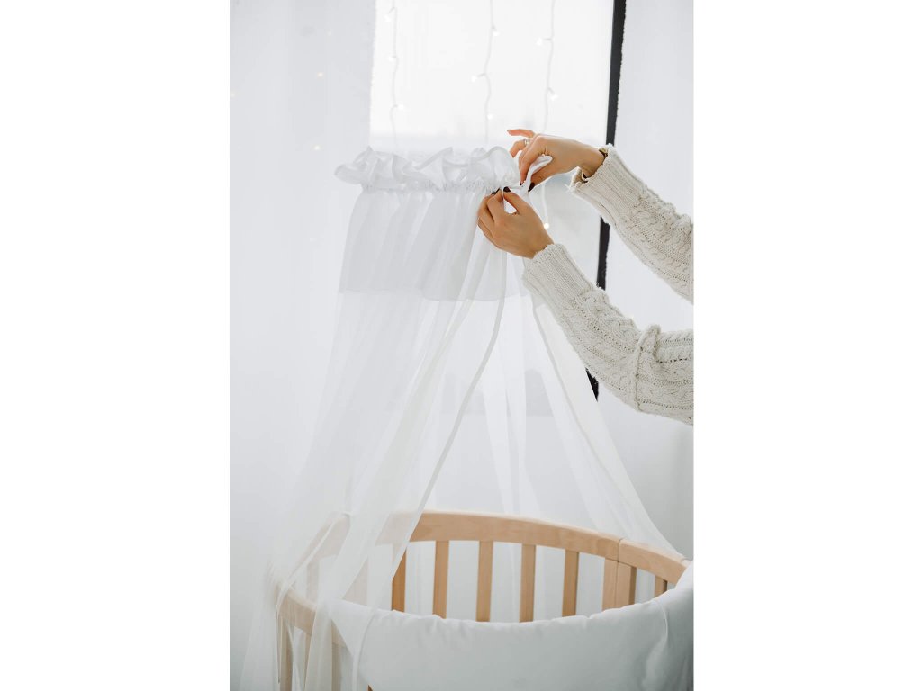 A kerek növekvő kiságy bükkfából készült, ökológiai vizes bázisú lakkal kezelve, amely megfelel az európai EV 71-3 normának. Ez a lakk biztonságos a gyermekek számára és ellenálló a mechanikai sérülésekkel szemben. A háromrészes matrac T25-ös habból készült pamut huzattal. A huzat 30° C-on mosható. Az ágyrács 5 magassági pozícióba állítható. A legalacsonyabb 7 cm, ebben a pozícióban járókaként használható. A legmagasabb pozíció pedig 49 cm. Amennyiben a gumis görgőket felszereli az ágyra az ágyrács magassága a legmagasabb pozícióban 55 cm lesz.