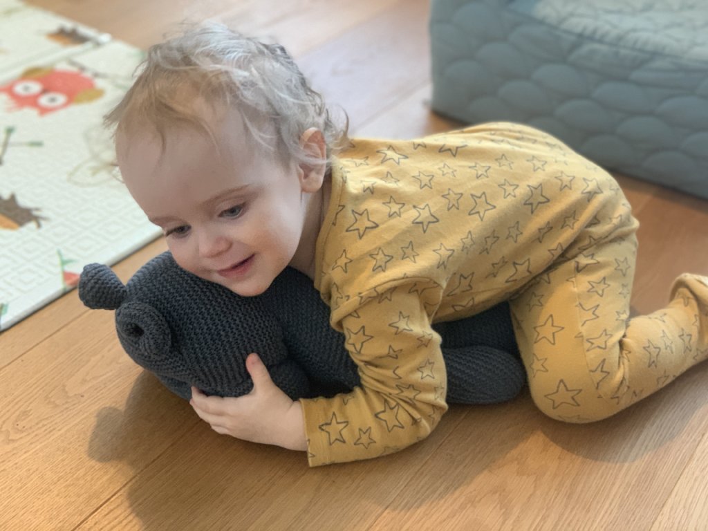 Szürke színű, kézzel horgolt víziló plüss játék, amely gyermeke kedvenc játéka lesz