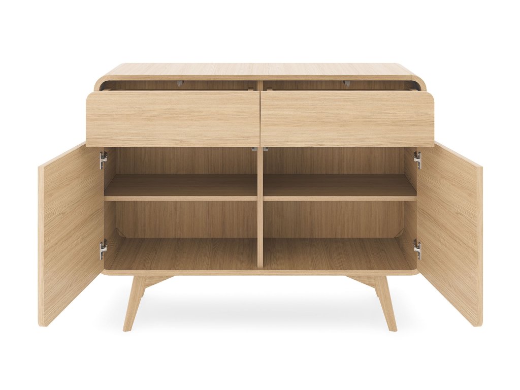 A Helion K108 modern komód egy sokoldalú és tágas bútordarab, amely kiválóan használható a nappaliban, az étkezőben vagy a hálószobában is. Méretének és négy zárt tárolórészének köszönhetően ideális a nagyobb tárgyak elhelyezésére. A két fiók ideális a kisebb tárgyak eléréséhez, például tökéletes lehet az evőeszközöknek az étkezőben, a dokumentumoknak a dolgozószobában vagy a kulcsoknak az előszobában. Az alsó rész két különálló, polcos kis szekrényre oszlik, amelyek bőséges helyet kínálnak a nagyobb tárgyak rendszerezett elhelyezéséhez. Az étkezőben az edények, poharak vagy terítők tárolására, míg a nappaliban a könyvek, magazinok vagy multimédiás eszközök számára is praktikus megoldás. A push-to-open rendszernek és a letisztult vonalvezetésnek köszönhetően a komód elegáns és légies hatást kelt, a teteje pedig remek helyet kínál a dekorációk, vázák elhelyezésére vagy akár egy stílusos bárpultként is szolgálhat.