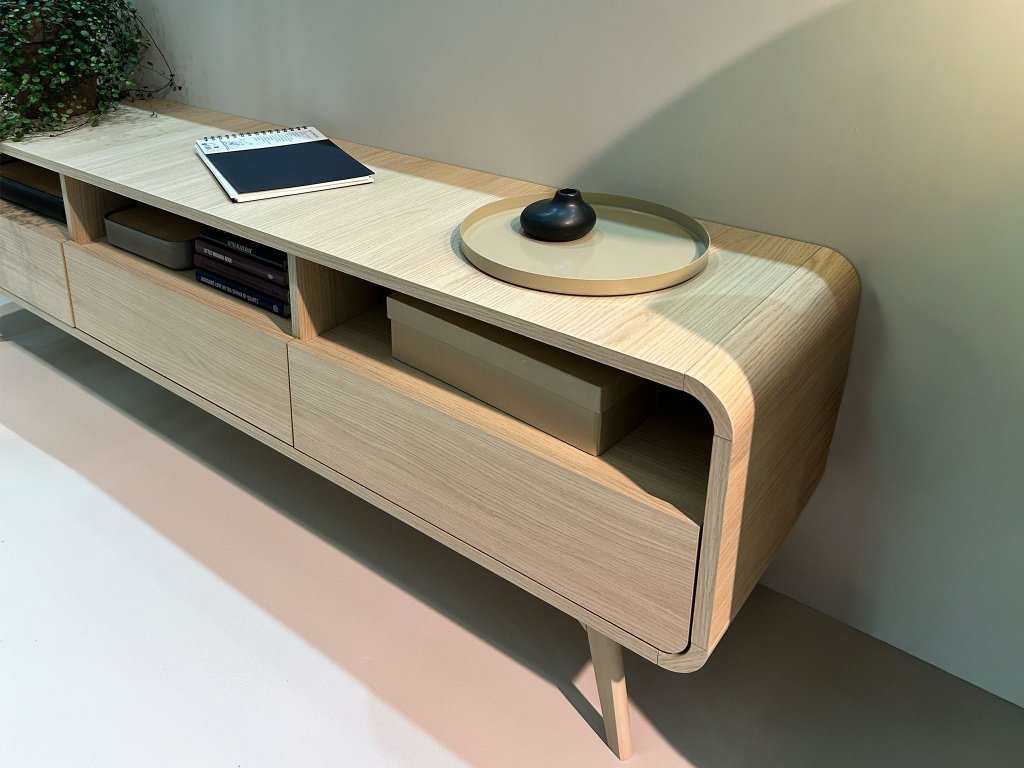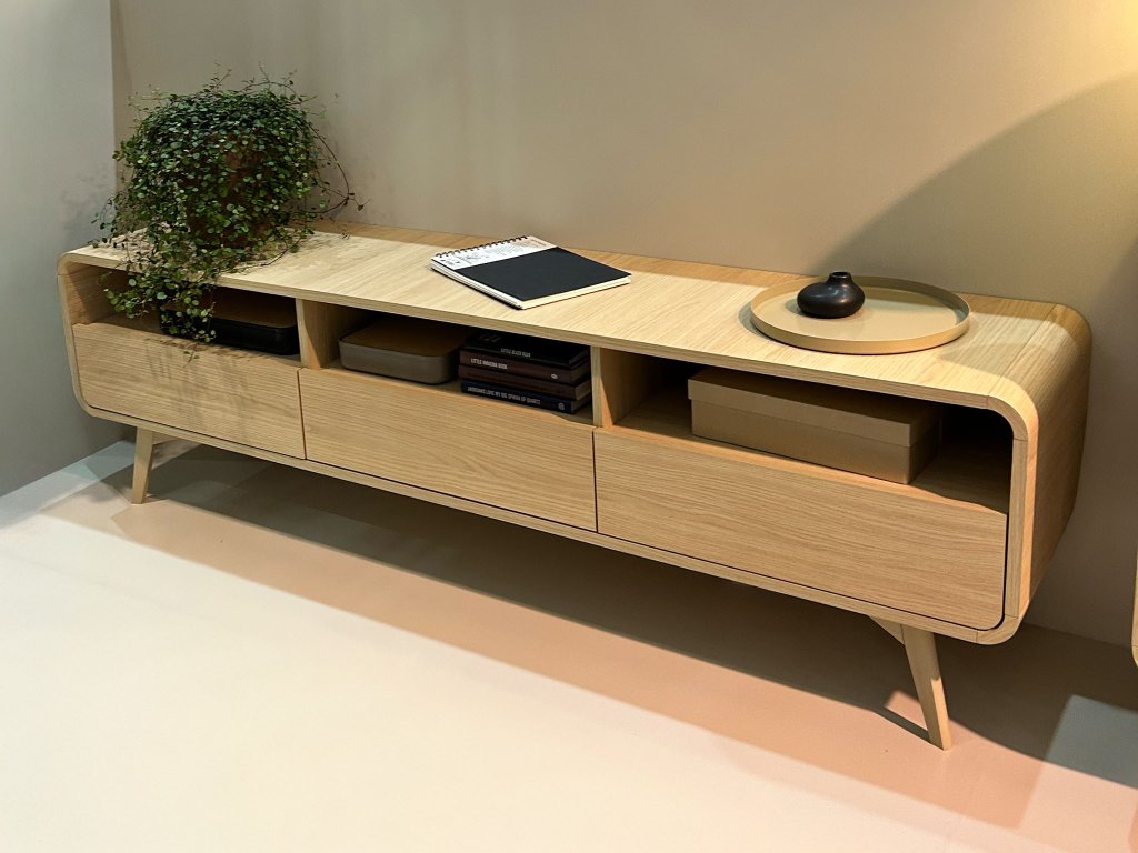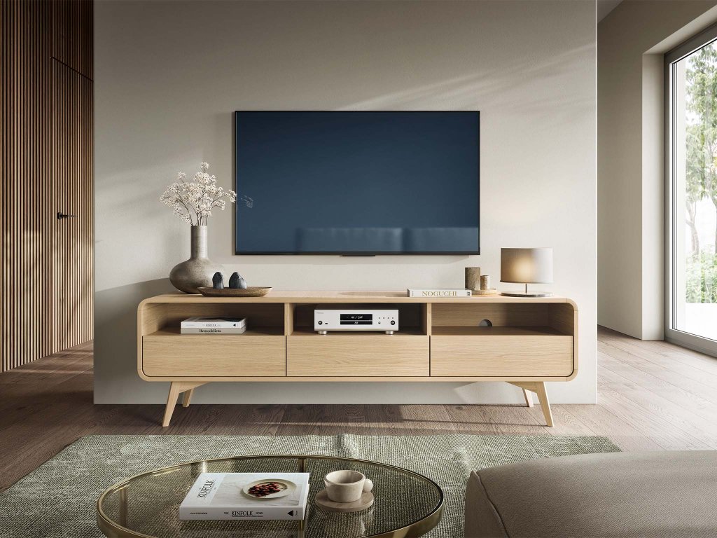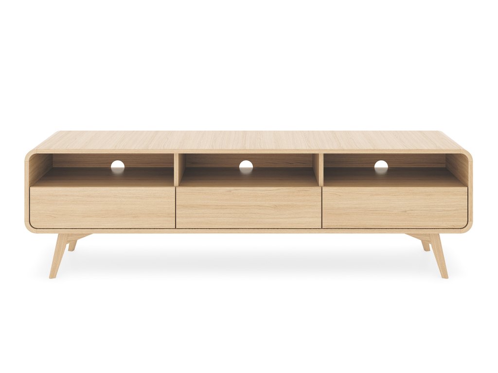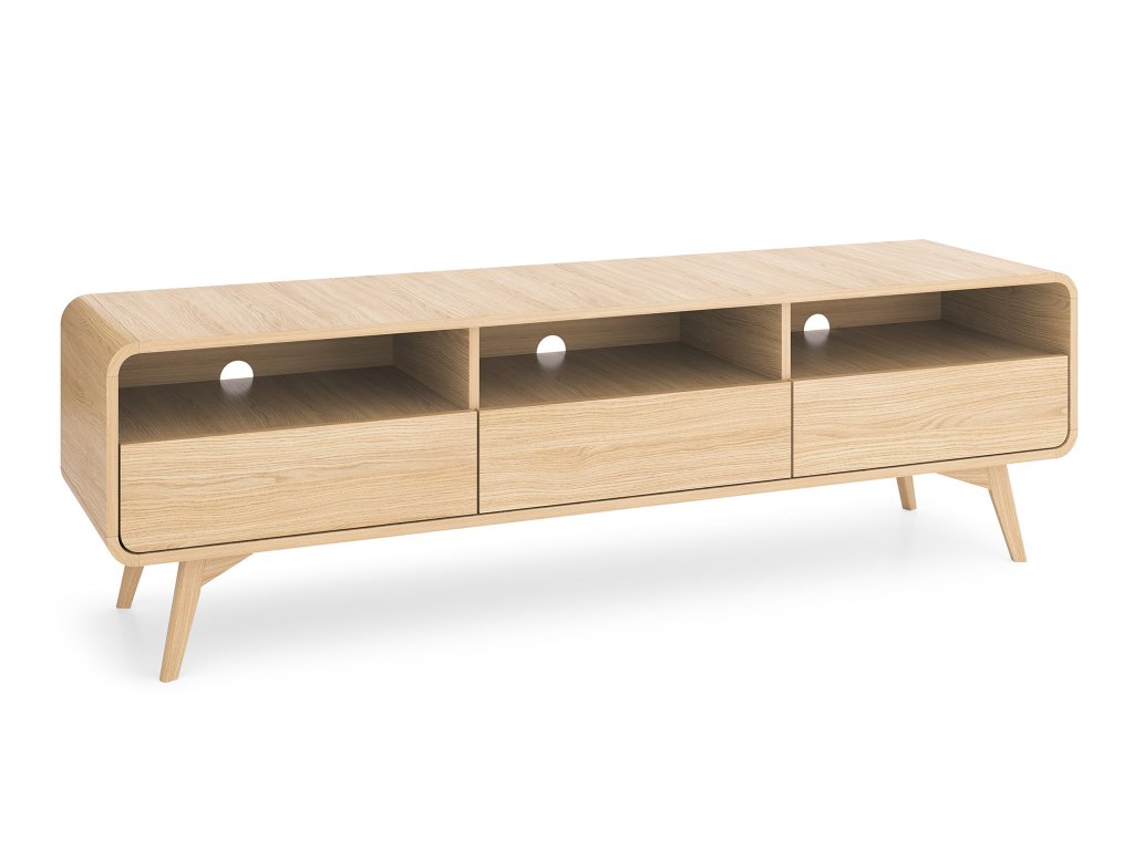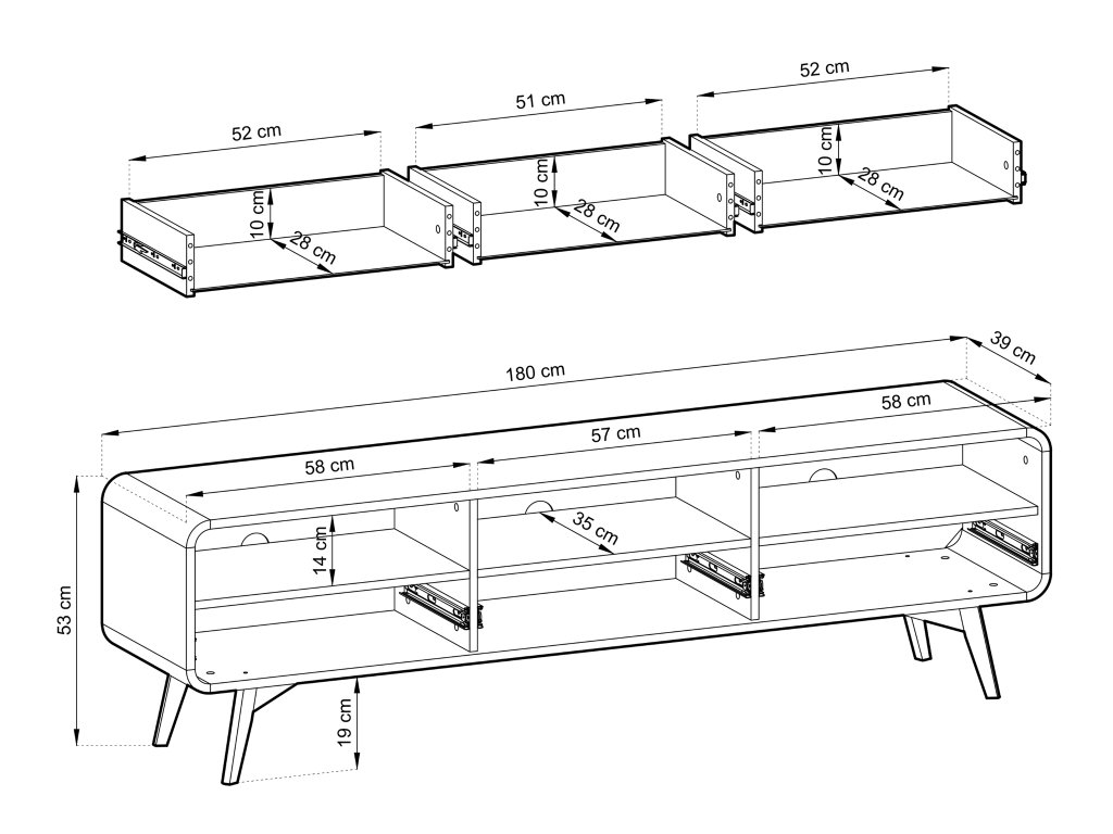 A HELION tévés asztal a modern stílust és a praktikumot ötvözi. Három nyitott polccal rendelkezik, kábelkivezető nyílásokkal. Emiatt tökéletes választás set-top box, játékkonzol vagy más AV-berendezés számára. Az alsó részében három tágas, fogantyú nélküli, push-to-open rendszerrel működő fiók található, amelyek elegendő tárolóhelyet biztosítanak. A lekerekített élei és a magas fa lábak elegáns, könnyed megjelenést kölcsönöznek ennek a TV szekrénynek, amely bármely modern otthonba remekül illik.