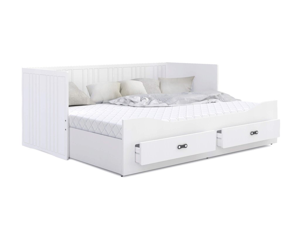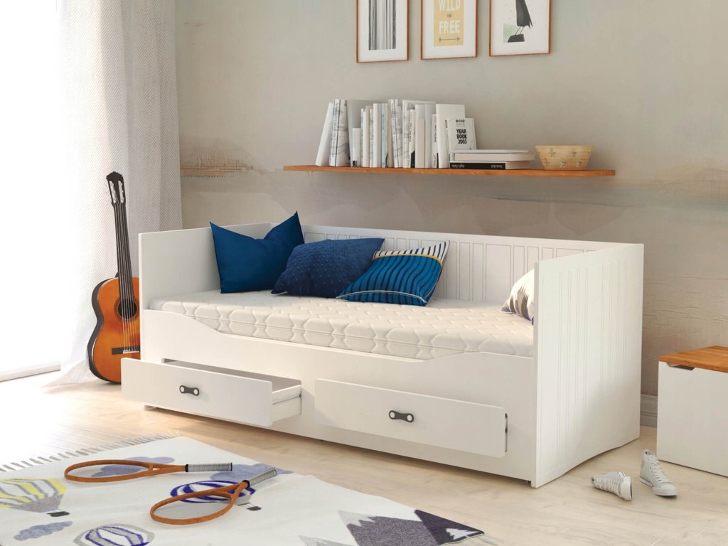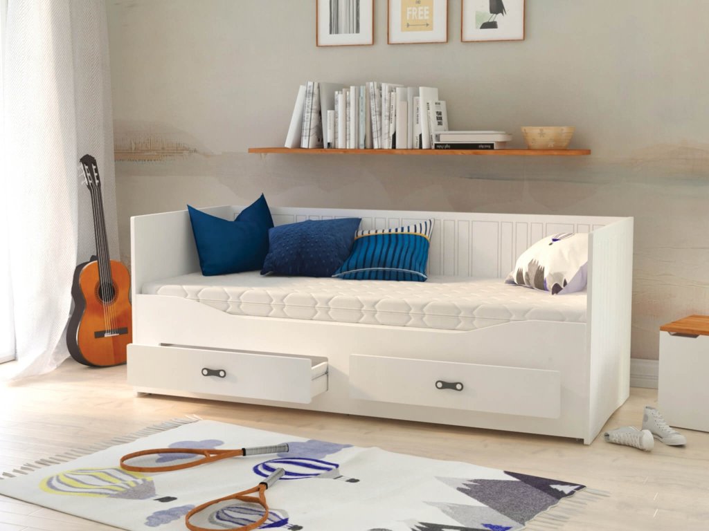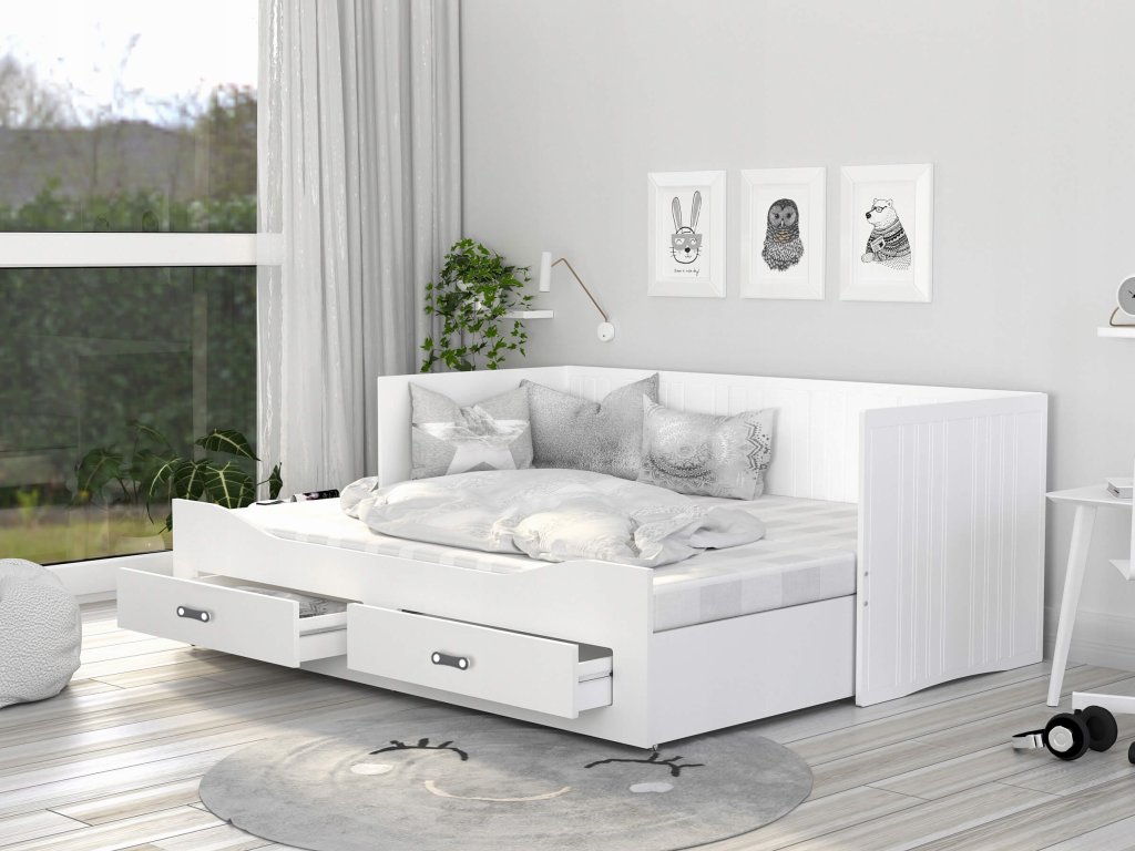 HERMES II fehér kinyitható ágy ágyneműtartóval, amely MDF-ből készül minőségi ABS élekkel. Az ágy nem csak a praktikusságával, de az ellenállóképességével és a stabilitásával is levesz majd mindenkit a lábáról. A stabilitásának köszönhetően nagyon biztonságos. Az ágy másik előnye az ágyneműtartó, itt tárolhatja az ágyneműt vagy egyéb tárgyait. Az ágy összecsukott állapotban egyszemélyes 200x80 cm-es ágyként használható, de az ágy kihúzható, és így egy kétszemélyes ágyat kap, melynek mérete 154x200 cm.
