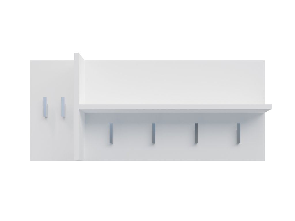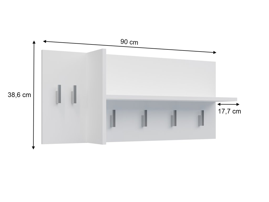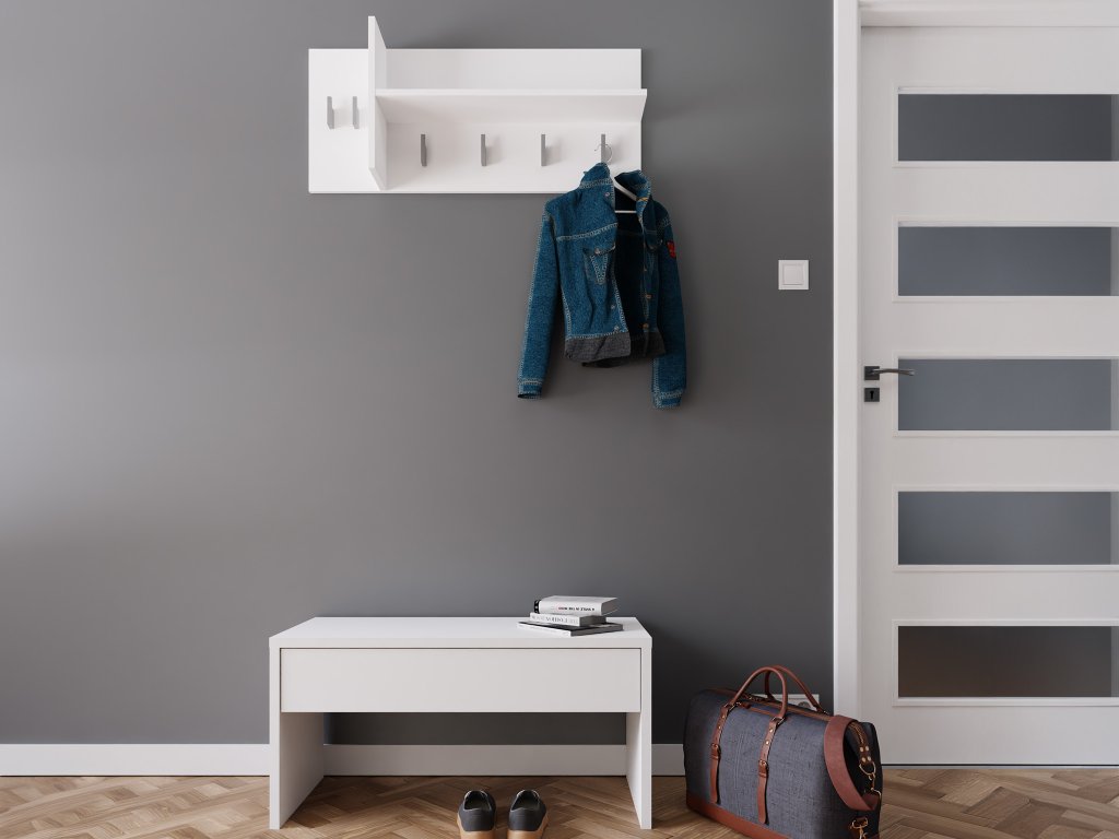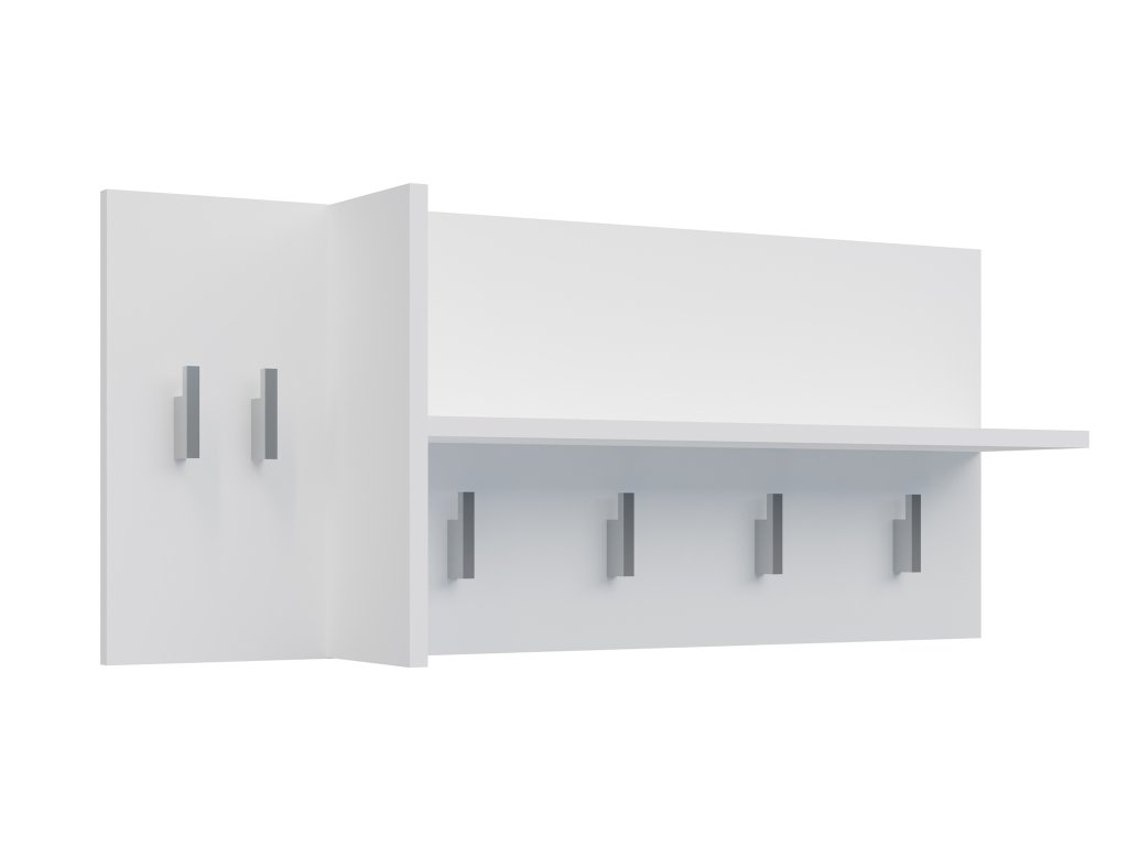 A magasfényű laminált bútorlap elegáns megjelenést kölcsönöz a ruhatartónak. A kabáttartó 6 akasztóval rendelkezik a kabátok, kulcsok vagy táskák felakasztásához. Emellett a fali fogas egy praktikus 5 kg-os teherbírású polccal is rendelkezik, amely ideális az esernyők, sálak vagy kesztyűk tárolására.