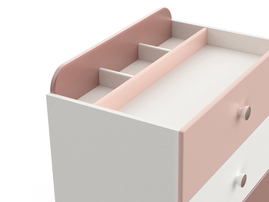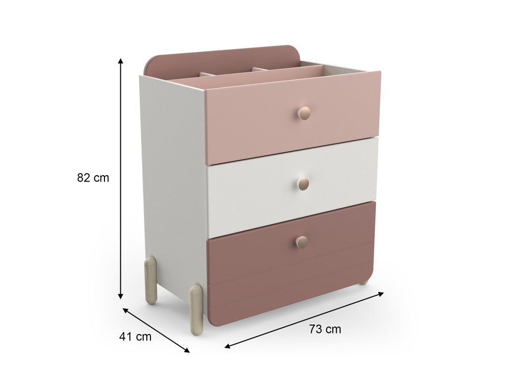 A JADE rózsaszín gyerekkomód egyszerűen elbűvöli majd Önt és gyermekét is. A matt rózsaszín - fehér színkombináció, valamint a világos tölgy színben készült tömör fa lábak modern, ugyanakkor természetes és meleg hatást keltenek. A háromfiókos komód lekerekített élekkel rendelkezik. A komód tetején elválasztott rekeszek vannak, ahol gyermeke tárolhatja a ceruzáit, ékszereit vagy az apróbb játékait. A háromfiókos komód számos helyet biztosít a ruháknak vagy az iskolai eszközöknek.