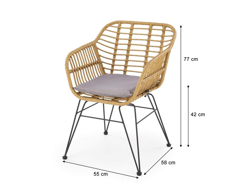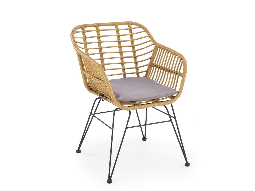 Modern K541 műrattan kerti szék világos színben. A fém lábak fekete porszórt festéssel készülnek, amely megvédi a lábakat a korróziótól. A kerti fotel stabil fém vázzal rendelkezik, amely igazán stabil és biztonságos. Az ülőfelület műrattannal átszőtt, amely ellenáll a kedvezőtlen időjárási viszontagságoknak és nagyon kényelmes ülést biztosít. Tegye otthonosabbá a teraszát vagy az erkélyét ezekkel a kényelmes székekkel, egy kerti asztallal vagy szőnyeggel.