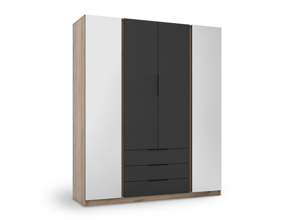 A Kaja fa szekrény egy négyrészes, tágas tárolóhelyet kínáló gardróbszekrény ruhái, személyes tárgyai, vagy akár ágyneműi számára. Elhelyezheti például a hálószobában, előszobában vagy bármely más helyiségben, ahol rendet szeretne tartani. Ez a széles szekrény 200 cm-es szélességű. Faanyagokból készült. Négy ajtóval rendelkezik, amelyeken kívül polírozott tükrök találhatók. Az ajtók halk záródásúak, fekete színű fém fogantyúkkal vannak ellátva. A szekrény belseje három fiókot, több polcot és egy akasztórudat tartalmaz.