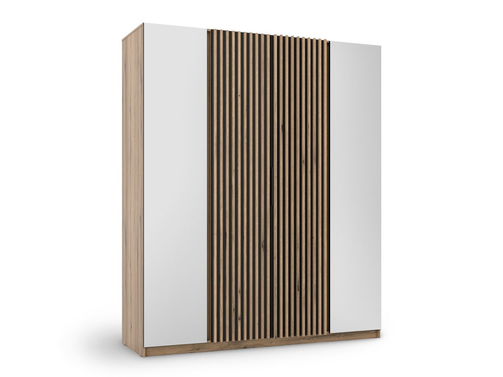 A Kaja négyajtós gardróbszekrény azok számára készült, akik praktikus tárolóhelyet keresnek. 200 cm szélességével elegendő helyet kínál ruhák, takarók és szezonális kiegészítők felakasztására és tárolására. A tölgy evoke faerezetű dekor és a függőleges lamellák kombinációja modern, mégis időtálló jelleget kölcsönöz neki. Ez a szekrény különféle belső terekbe illeszkedik, az otthonos hálószobától a tágas előszobáig. A szekrény váza masszív, magas minőségű anyagokból készült, amelyek stabilitást és hosszú élettartamot biztosítanak. Az ajtók halk záródású mechanizmussal vannak felszerelve, fekete fém fogantyúkkal kiegészítve. Az ajtók elülső felületén tükörpanel található, amely optikailag bevilágítja és tágítja a teret. A szekrény belsejében több polc áll rendelkezésre és tágas hely a ruhák tárolására.