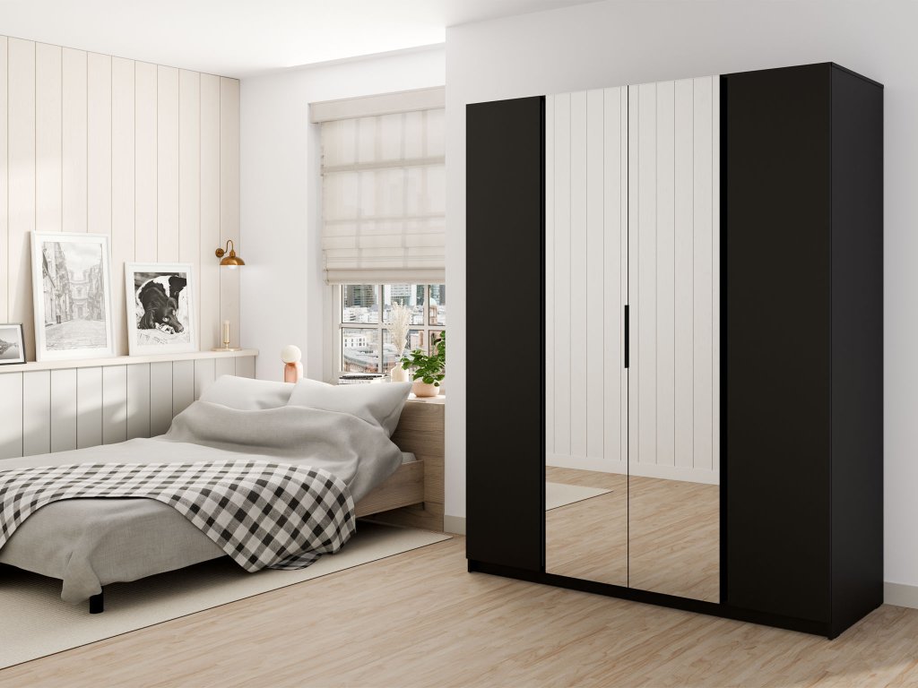 A Kaja gardróbszekrény ideális megoldás minden otthon számára. 200 cm szélességével elegendő helyet biztosít ruhák, ágynemű, szezonális kiegészítők és egyéb tárgyak tárolására. Ez a négyrészes szekrény bármilyen bútorszínhez illik otthonában, köszönhetően modern fekete kivitelének. Helyezheti hálószobába, előszobába vagy bármely más helyiségbe az otthonában. Minőségi anyagokból készült. A szekrény ajtajai halk záródásúak, fekete fém fogantyúkkal vannak ellátva. Az ajtók belső oldalán praktikus tükör található. A szekrény belső elrendezése akasztórudat és több polcot foglal magába.