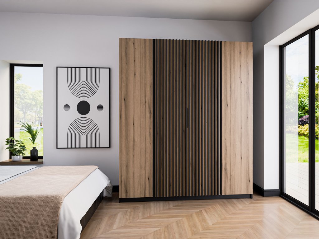 A modern stílus és a funkcionalitás kombinációja, amely már első pillantásra magával ragad. 200 cm-es szélességével ez a tágas szekrény bőséges tárolóhelyet kínál ruhái, ágyneműi és szezonális tárgyai számára egyaránt. Időtálló dizájnjának köszönhetően tökéletesen illik nemcsak hálószobába, hanem előszobába vagy otthona más helyiségeibe is. Ez a négyajtós szekrény minőségi és tartós anyagokból készült, mely biztosítja hosszú élettartamát és megbízhatóságát. Különösen értékelni fogja a halk záródású ajtókat, amelyek maximális kényelmet nyújtanak a mindennapi használat során. A fekete fém fogantyúk könnyű ajtónyitást tesznek lehetővé. A modern megjelenést a belső ajtókon található lamellás panel hangsúlyozza. A szekrény belseje logikusan kialakított, elegendő polccal és akasztóruddal rendelkezik, így mindig rendet és átláthatóságot biztosít személyes tárgyai között.