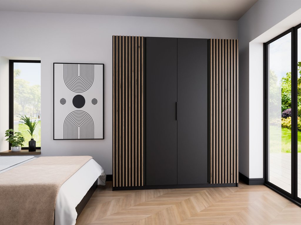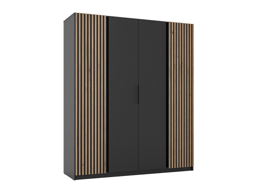 A Kaja modern szekrény a funkcionalitást és a modern dizájnt ötvözi, amely első pillantásra megragadja a figyelmet. 200 cm-es szélességével bőséges helyet biztosít ruhái, ágyneműi vagy szezonális kiegészítői számára. Univerzális stílusának köszönhetően nemcsak a hálószobába, hanem az előszobába vagy más lakóterekbe is remekül illeszkedik. A négyrészes szekrény minőségi anyagokból készült, ami hosszú élettartamot garantál. Négy, halk záródású ajtóval rendelkezik, amit különösen a mindennapi használat során fog értékelni. A fekete fém fogantyúk elegáns kontrasztot alkotnak, és kényelmes használatot tesznek lehetővé. Az összképet tovább fokozza a modern lamellás panel, amely stílusos megjelenést biztosít a szekrénynek. A belső tér áttekinthetően és praktikusan tagolt, polcokkal és akasztórúddal ellátva.